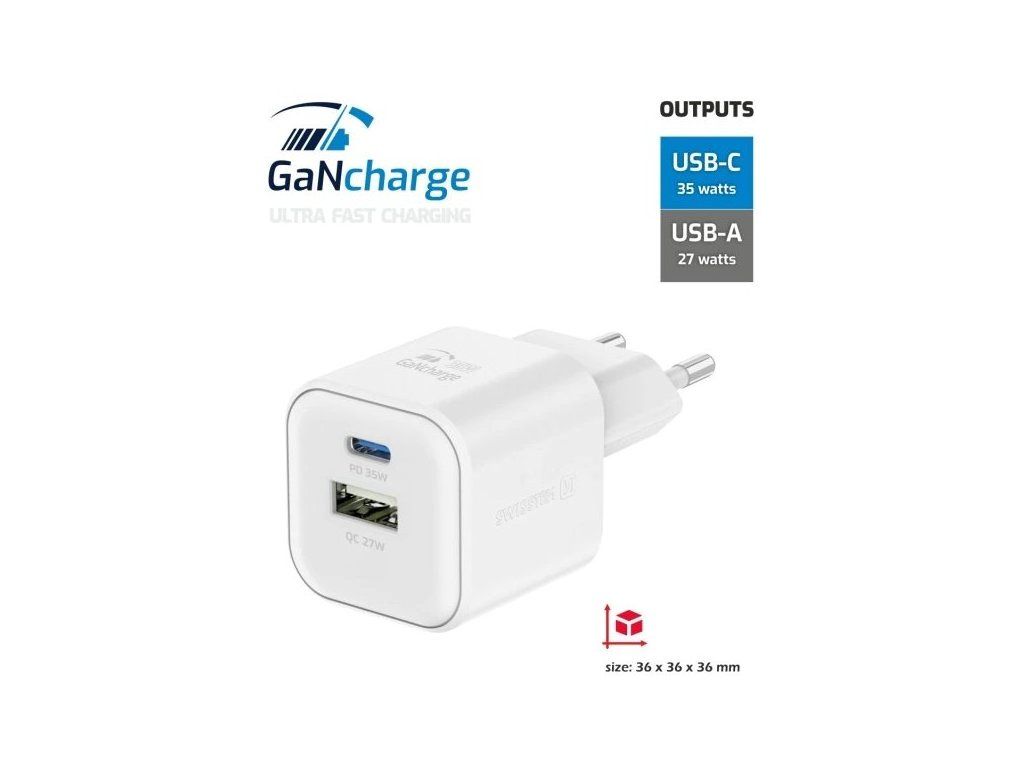 SWISSTEN GaN 1× USB-C PD 35 W + 1× USB QC 27 WUniverzální napájecí adaptér nabízející jeden konektor USB-C s výkonem až 35 W a jeden konektor USB s výkonem až 27 W. Adaptér podporuje protokoly rychlého nabíjení Power Delivery a Quick Charge 4.0. Použitá GaN technologie snižuje tvorbu tepla, čímž zvyšuje účinnost nabíječky při zachování kompaktních rozměrů (přibližně 3,6 × 3,6 × 3,6 cm). Samozřejmostí je ochrana proti zkratování, přepětí, přetížení nabíjení a vysoké teplotě.