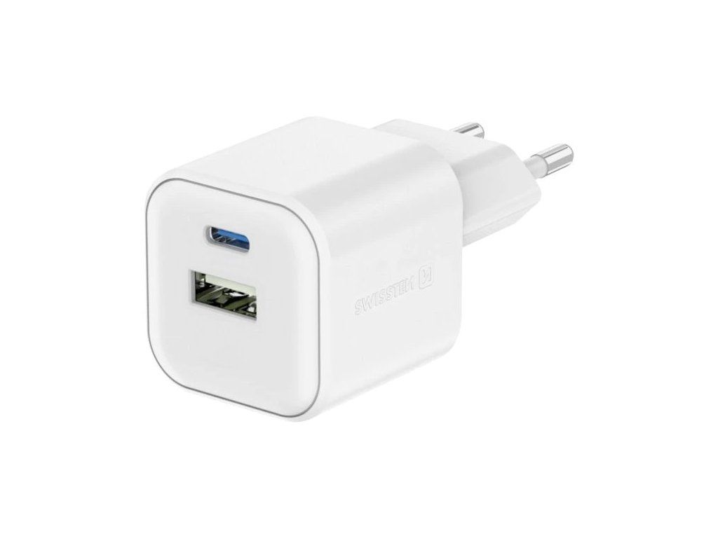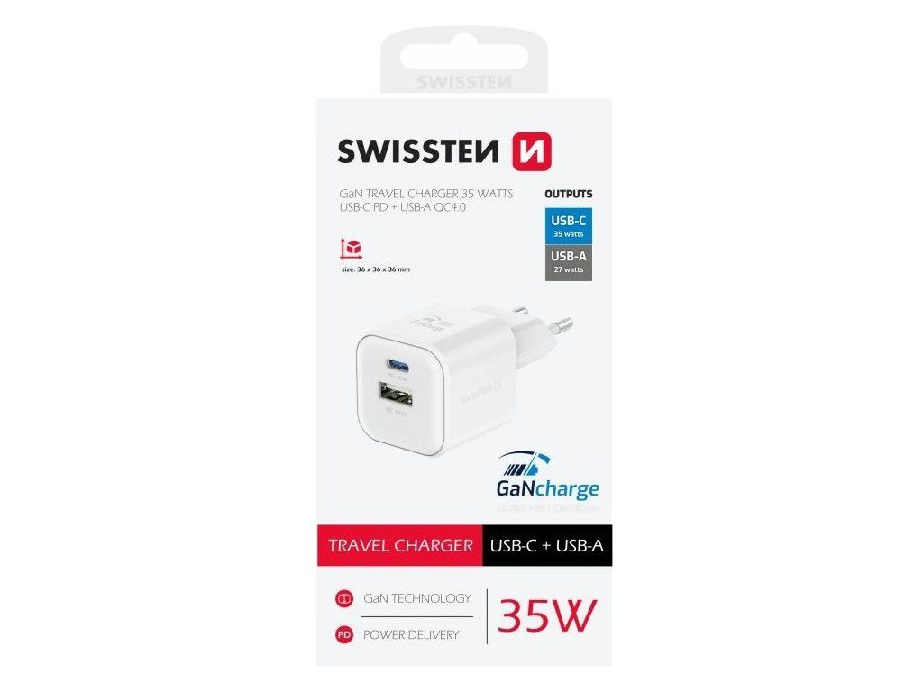 Swissten síťový adaptér gan 1x usb-c 35w pd + 1x usb-a 27w qc bílý
