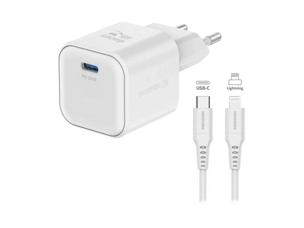 Swissten síťový adaptér gan 1x usb-c 35w power delivery bílý + datový kabel usb-c/lightning 1,2 m bílý