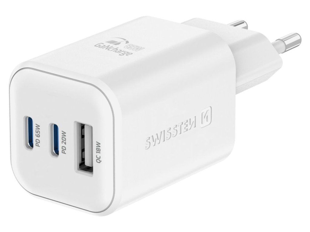 Swissten síťový adaptér gan 2x usb-c 65w pd + 1x usb-a 18w qc bílý