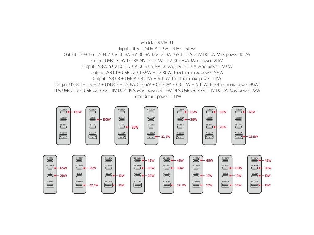 USB-C 1, USB-C 2: DC 5V/3A; 9V/3A; 12V/3A; 15V/3A; 20V/5A; PPS: 3,3–11V/4,05A; max. 100 W