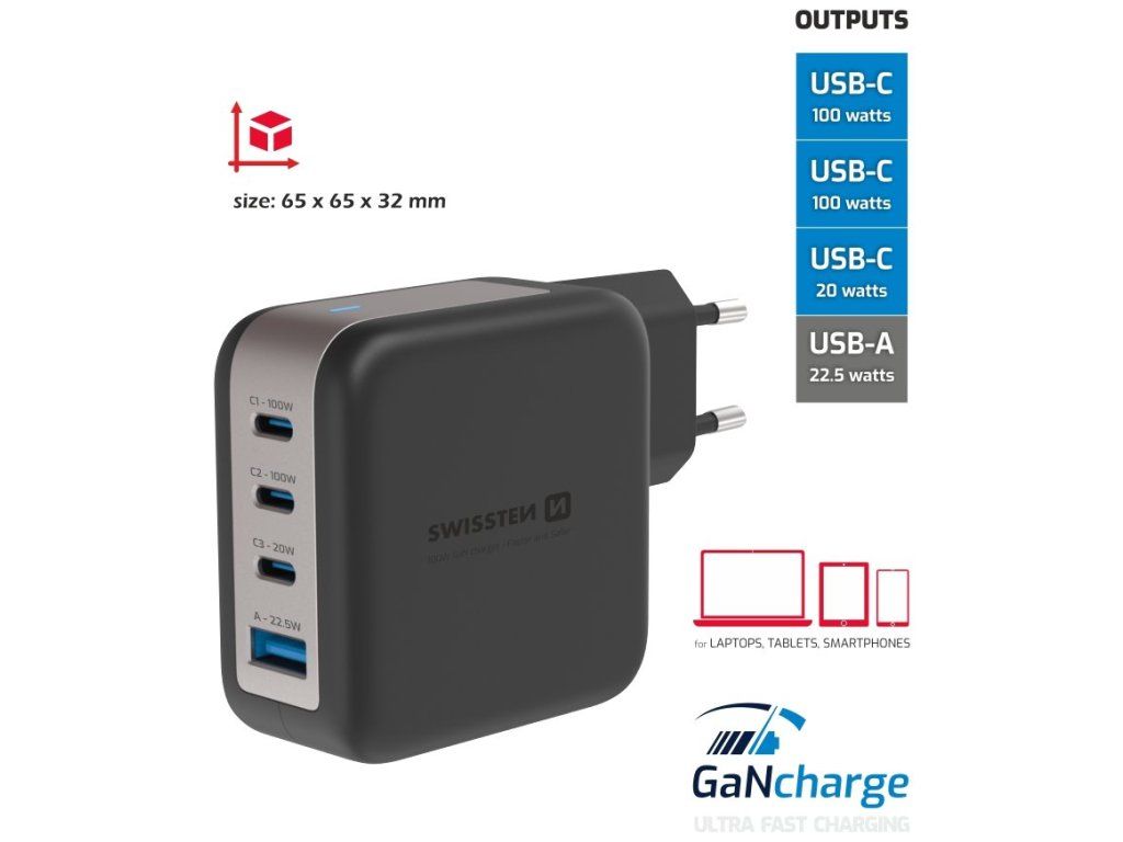 SWISSTEN GaN 3× USB-C PD 100 W + 1× USB QCUniverzální napájecí adaptér s výkonem až 100 W. Pro nabíjení zařízení jsou k dispozici tři USB-C a jeden USB konektor. Adaptér podporuje protokoly rychlého nabíjení Power Delivery a Quick Charge. Použitá GaN technologie snižuje tvorbu tepla, čímž zvyšuje účinnost nabíječky při zachování kompaktních rozměrů (65 × 65 × 32 mm). Díky vyššímu výstupnímu výkonu umožňuje dobíjet také vybrané notebooky s USB-C portem a podporou Power Delivery.