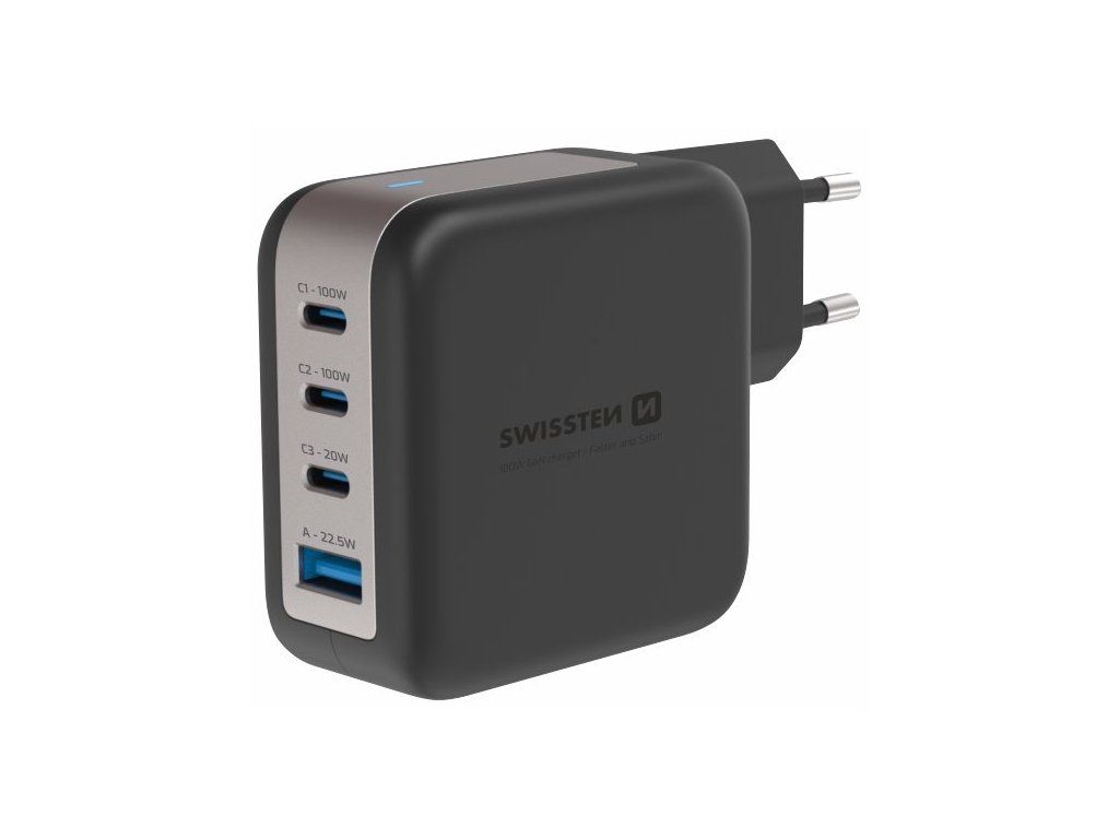 Swissten síťový adaptér gan 3x usb-c 100w pd + 1x usb-a 18w qc černý