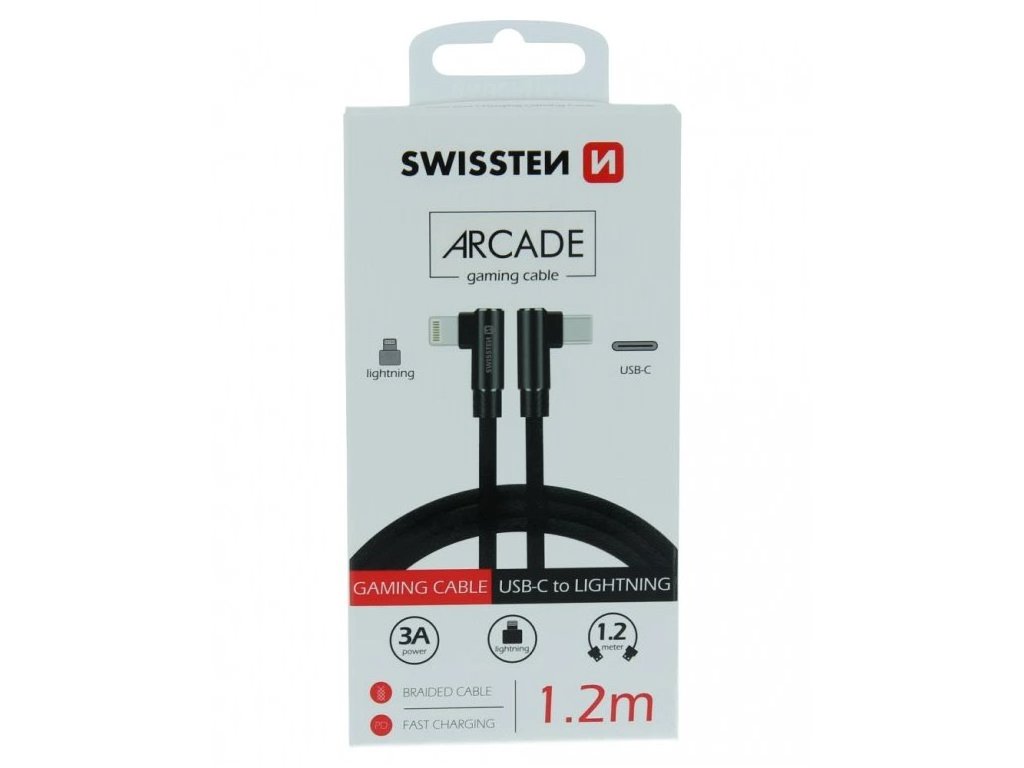 SWISSTEN ARCADE USB-C na Lightning 1,2 mDatový a nabíjecí USB-C na Lightning kabel s textilním opletením nabízí konektory otočené o 90° do tvaru písmene L pro bezpečnější manipulaci s telefonem během nabíjení. Konektor ve tvaru L snižuje možnost zalomení kabelu nebo poškození konektoru telefonu, díky tomu je praktický i při nabíjení telefonu v držáku v autě nebo při dobíjení v uzavřeném pouzdře z powerbanky. Kabel navíc kromě přenosu dat rychlostí 480 Mb/s podporuje také nabíjení proudem až 3 A.
