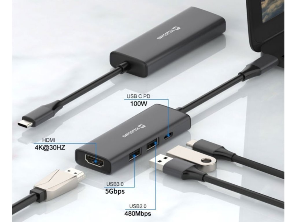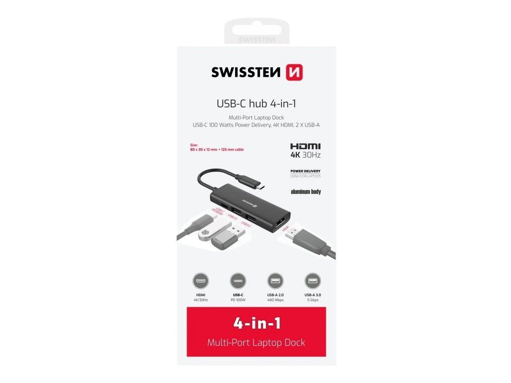 SWISSTEN USB-C HUB 4v1 44040201Kompaktní a praktická dokovací stanice, která snadno rozšíří konektivitu zařízení, jako jsou notebooky či tablety. Připojuje se pomocí USB-C portu, skrze který může také přenášet napájení o výkonu až 100 W. Nabízí HDMI port s podporou rozlišení 4K při 30 Hz, jeden USB 3.0 port s přenosovou rychlostí až 5 Gb/s a jeden USB 2.0 port s rychlostí 480 Mb/s. Je vyrobena z odolného hliníku, což zajišťuje pevnost a odolnost vůči opotřebení.