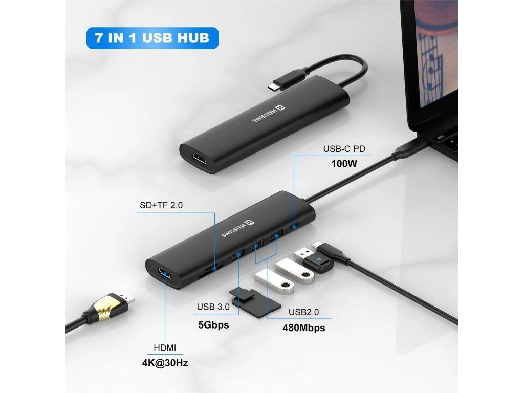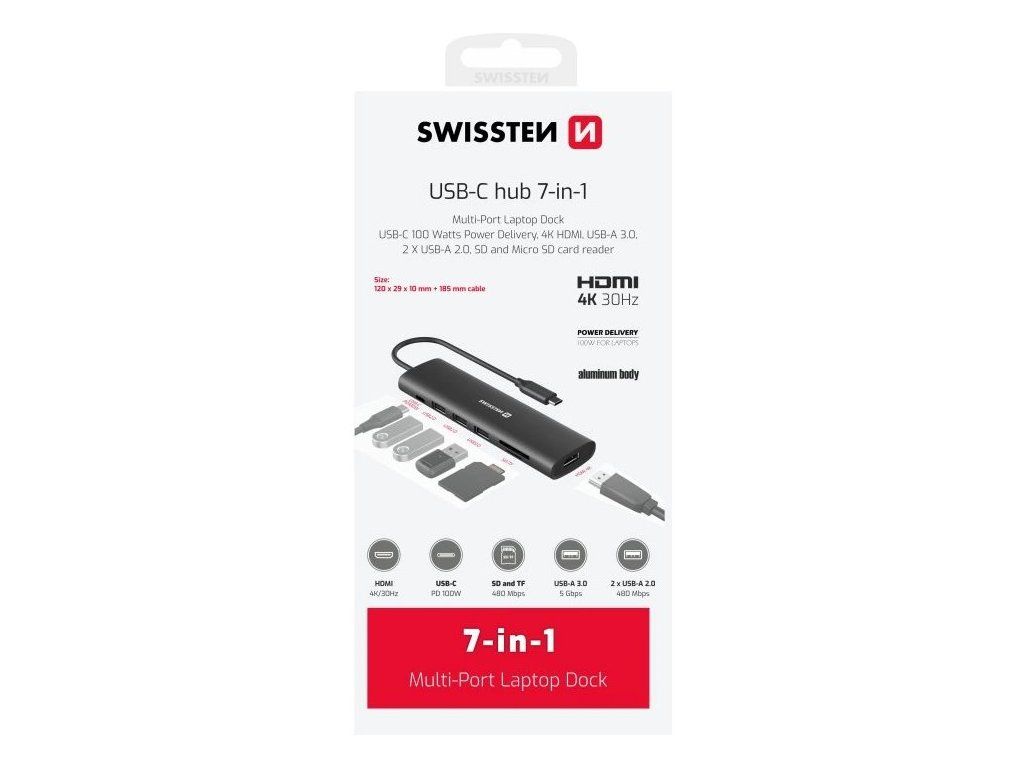 Swissten usb-c hub 7-in-1 (usb-c 100w, hdmi 4k, 1x usb-a 3.0, 2x usb-a 2.0, sd, micro sd) aluminium