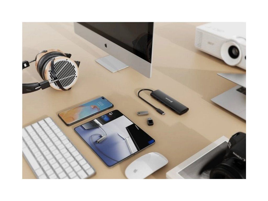 SWISSTEN USB-C HUB 7v1 44040202Kompaktní a praktická dokovací stanice, která snadno rozšíří konektivitu zařízení, jako jsou notebooky či tablety. Připojuje se pomocí USB-C portu, skrze který může také přenášet napájení o výkonu až 100 W. Nabízí HDMI port s podporou rozlišení 4K při 30 Hz, jeden USB 3.0 port s přenosovou rychlostí až 5 Gb/s a dva USB 2.0 porty s rychlostí 480 Mb/s. Přítomna je také čtečka paměťových karet formátu SD a micro SD. Vyrobena je z odolného hliníku, což zajišťuje pevnost a odolnost vůči opotřebení. Díky technologii Plug & Play je zařízení připraveno k okamžitému použití bez nutnosti instalace.