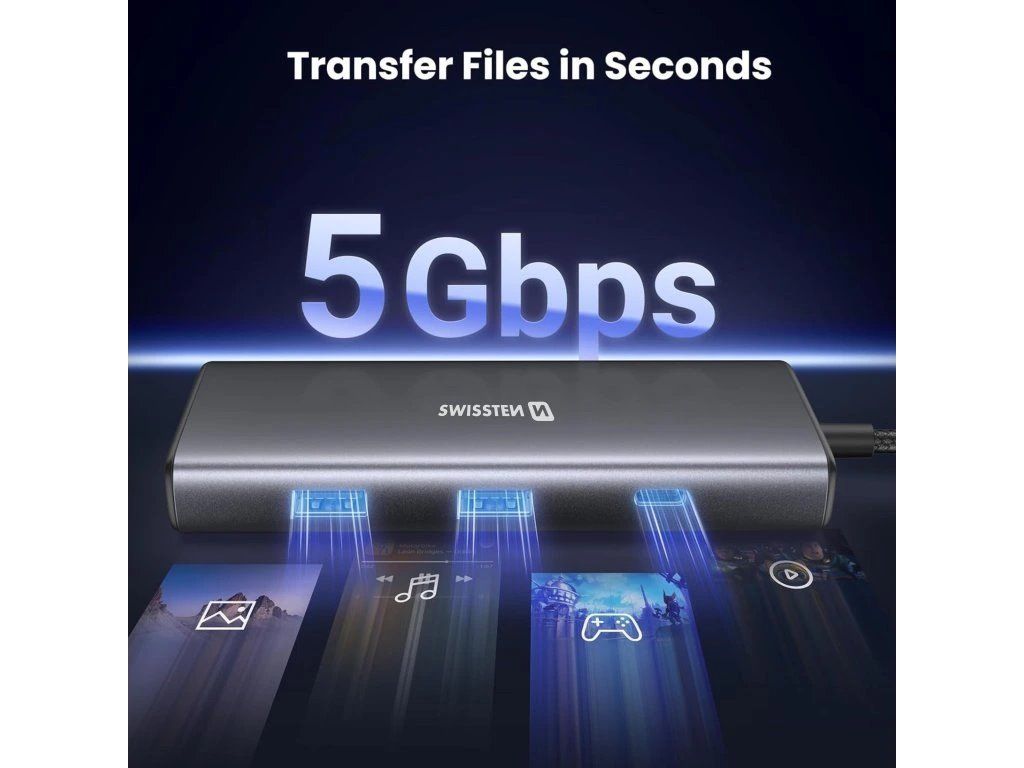 SWISSTEN USB-C HUB 8v1 44040203Kompaktní a praktická dokovací stanice, která snadno rozšíří konektivitu zařízení, jako jsou notebooky či tablety. Připojuje se pomocí USB-C portu, skrze který může také přenášet napájení o výkonu až 100 W. Nabízí HDMI port s podporou rozlišení 4K při 30 Hz, dva USB 3.0 porty a jeden USB-C port s přenosovou rychlostí až 5 Gb/s. Přítomna je také čtečka paměťových karet formátu SD a micro SD nebo port RJ-45 pro stabilní kabelové připojení k internetu. Vyrobena je z odolného hliníku, což zajišťuje pevnost a odolnost vůči opotřebení. Díky technologii Plug & Play je zařízení připraveno k okamžitému použití bez nutnosti instalace.