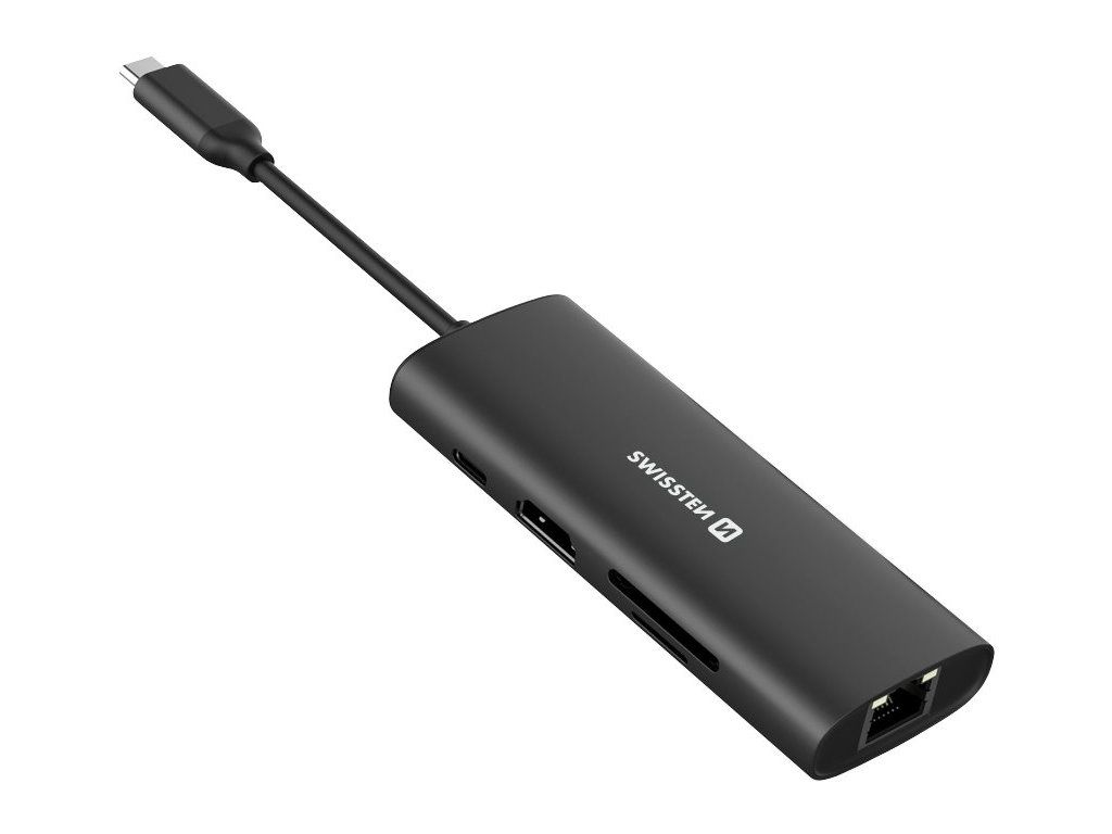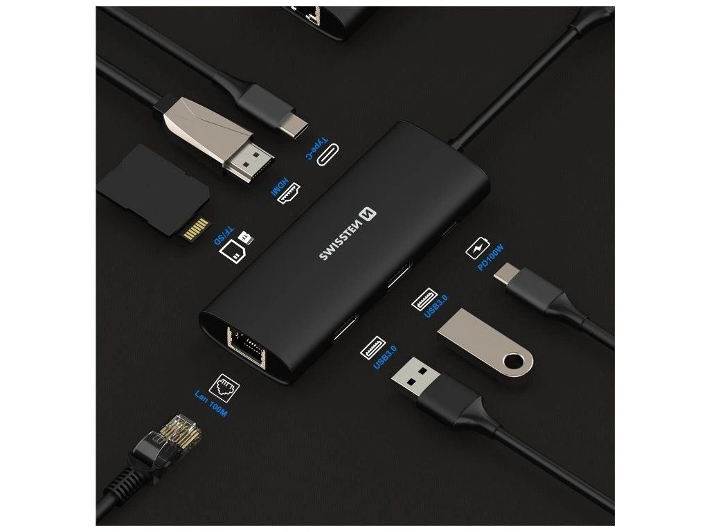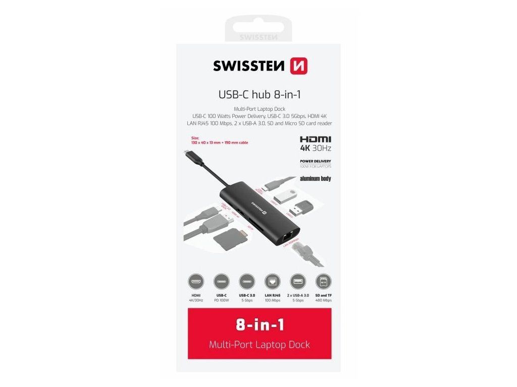 Swissten usb-c hub 8-in-1 (usb-c 100w, hdmi 4k, lan rj45, 2x usb-a, 1x usb-c 5gbps, sd, micro sd) aluminium
