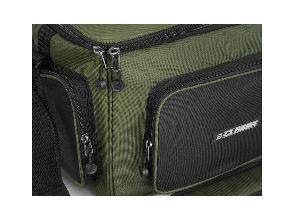 Taška Delphin Classa CarryALL XL je ideálním společníkem pro vaši rybářskou výpravu. Tato prostorná a funkční taška byla speciálně navržena pro organizaci a přepravu potřebného vybavení a oblečení na místo lovu. Je vyrobena z trvanlivých a odolných materiálů, které zaručují její dlouhou životnost a ochranu obsahu uvnitř před nepříznivými podmínkami. Taška je v rozích vyztužená, takže si zachovává svůj tvar, i když je prázdná. Spodní část je navíc opatřena gumovým materiálem, který zamezuje proniknutí vlhkosti z mokré země, a tak chrání vaše oblečení a vybavení před navlhnutím. Kromě hlavního úložného prostoru disponuje dvěma bočními a jednou přední zipovatelnou kapsou pro menší příslušenství. Pod víkem tašky se nachází praktická zipovatelná kapsa ze síťoviny. Hlavní prostor tašky je navržen tak, aby do něj bylo možno ukládat další tašky ze série CLASSA, SPACE či AREA. Taška je opatřena kvalitními zipy, jejichž běžce jsou opatřeny gumovými taháčky s logem Delphin. Tašku lze přenášet pomocí textilního úchopu na vrchní straně, nebo pomocí pohodlného popruhu pro nošení přes rameno. Technické parametry XL: Rozměr tašky: 45x35x25cm Čistý rozměr vnitřního prostoru: 38x28x23cm Rozměr přední kapsa: 25x17x3cm Rozměr boční kapsa: 20x17x3cm