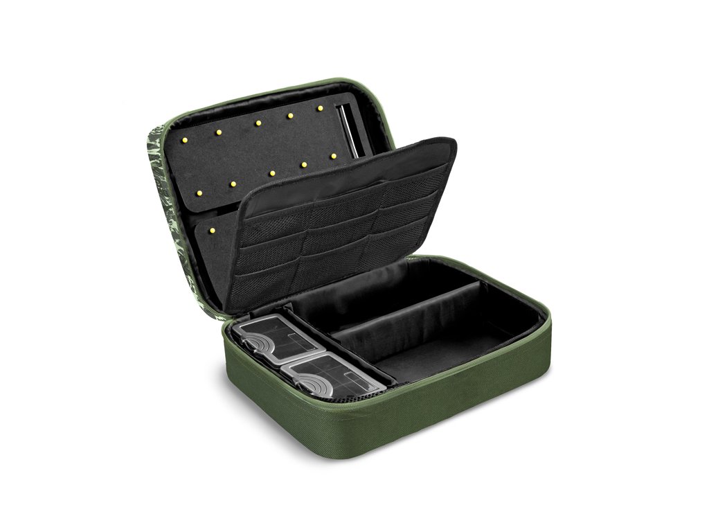 Delphin SPACE je označení pro exkluzivní sérii tašek z dílny značky Delphin. Vyznačuje se špičkovým zpracováním, kvalitními zipy, ale zejména výjimečným designem s použitím C2G kamufláže. Uložit všechny komponenty a návazce byl pro aktivního kapraře vždy boj. Až do momentu, dokud jsme nenavrhli design modelu RigStation. Taška, která poskytuje obrovský úložný prostor a je zároveň kompaktní. Taška, která spojuje penál na návazce s taškou na bižuterii. Hlavní přihrádka poskytuje velkorysý prostor pro uložení různé bižuterie, návazcových šňůr a nářadí potřebného k sestavení vašich montáží. Navíc se v ní nacházejí 4 praktické krabičky, ve kterých bude vaše bižuterie vždy v pořádku. Středový panel je opatřen malými síťovými kapsami na jedné straně a velkou síťovou kapsou na straně druhé. Díky tomuto provedení vždy vidíte, co se nachází uvnitř a bez problémů tak najdete vždy tu požadovanou část výbavy. RigStation obsahuje také dvě pěnové plochy sloužící k dokonalému uspořádání a uchycení vašich návazců. Devizou této tašky je také úchop, situovaný v horní části, díky čemuž tašku při transportu nepřevracíte a všechny komponenty v ní jsou tak stále na svém místě. Navíc je vybavena kvalitními zipy s efektními plastovými taháčky. Technické parametry: Rozměry: 31cm x 24cm x 11cm Vnitřní kapsa: 30cm x 23cm x 7cm Rozměr přepážek uvnitř: 10cm x 8cm Rozměr přepážek uvnitř: 21cm x 14cm Rozměr plastových krabiček: 10,5cm x 6,5cm x 2,5cm Rozměr penové plochy: 27cm x 10cm x 1cm Stylová patentovaná kamufláž z dílny značky Delphin pod označením C2G má mnoho podob a úhlů pohledu. Přesně tak i její název, který můžeme volně přeložit jako Carpath 2. generace, což přímo odkazuje na jejího předchůdce, ale můžeme ho číst i jako Carpath to Green, tedy přechod myšlenky Carpathu do zelené barvy. Její jedinečnost a nezaměnitelnost spočívá v prvcích, ze kterých je vytvořena. Na první dojem jde o kamufláž tvořenou třemi různými odstíny zelené. Všechno se však změní při detailnějším pohledu, kdy si všimnete siluety kaprů, komponent kaprařské montáže a log značky Delphin spolu s označením C2G. Díky tomuto neopakovatelnému provedení se vaše rybářská výbava okamžitě stane jedinečnou a maximálně originální.
