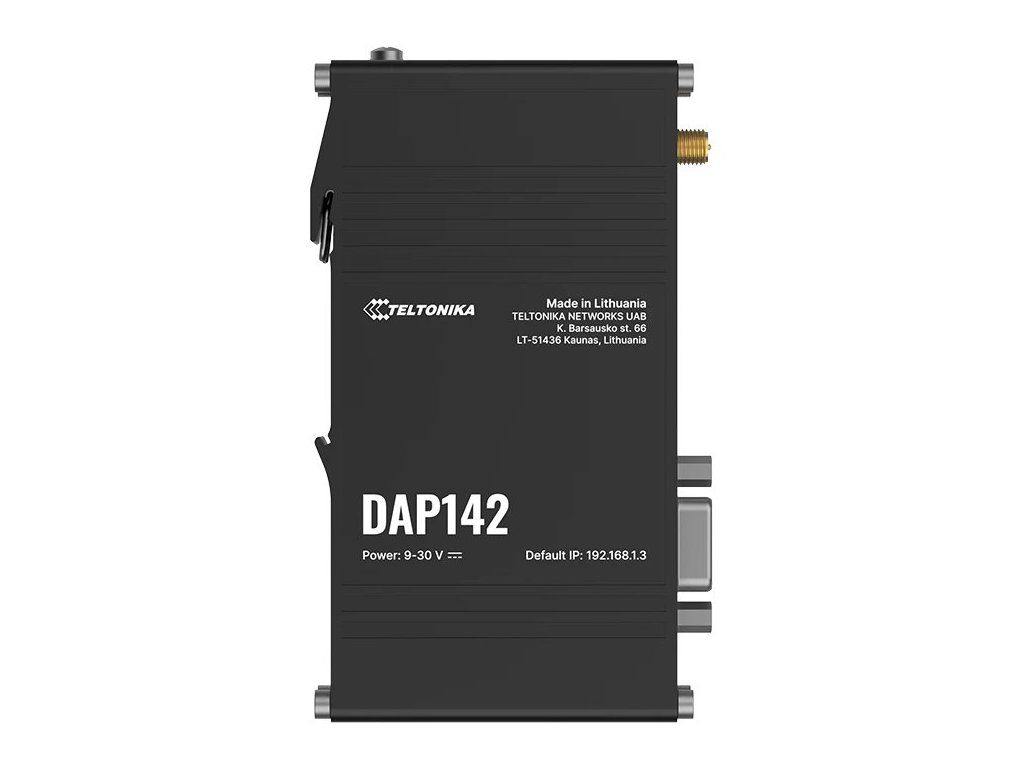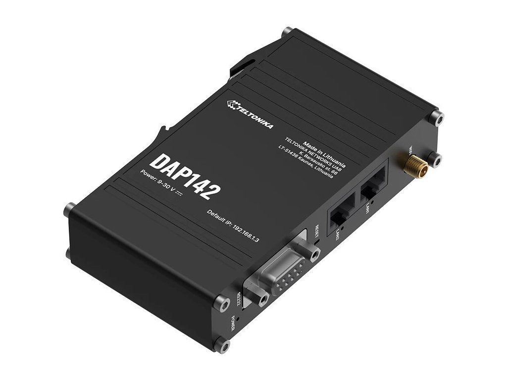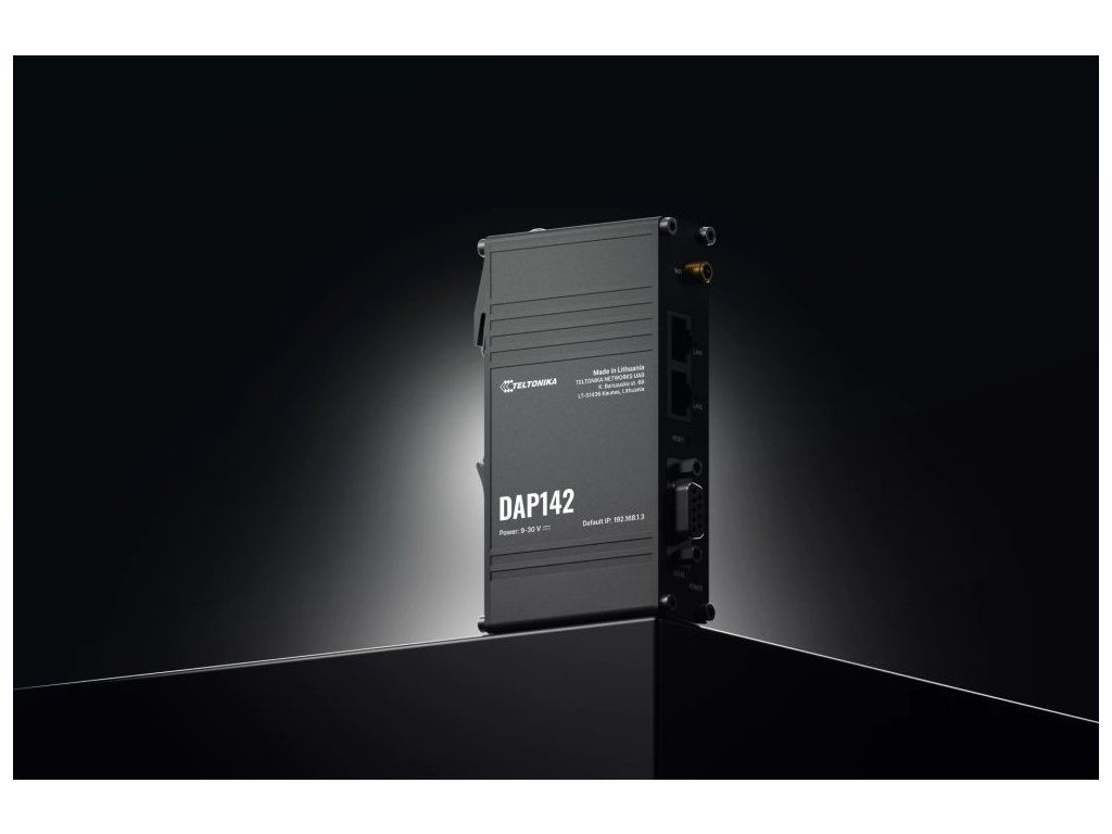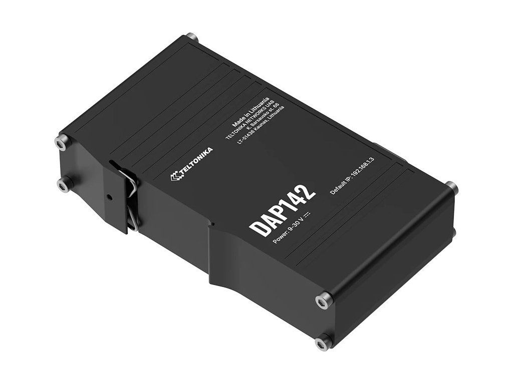 Teltonika DAP142Průmyslový bezdrátový přístupový bod s podporou pasivního PoE napájení, navržený pro náročné průmyslové prostředí. Podporuje Wi-Fi 4 (802.11 b/g/n) s pokročilými funkcemi jako Wi-Fi mesh (802.11s), Fast Roaming (802.11r), BSS Transition Management (802.11v) a dalšími.