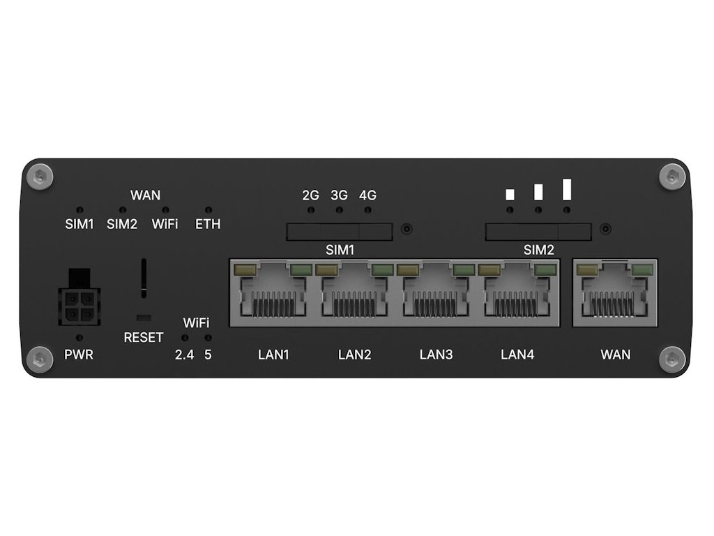Router nabízí dvoupásmovou Wi-Fi 6 (802.11ax) s rychlostí až 2402 Mbps na 5 GHz a 576 Mbps na 2,4 GHz s podporou MU-MIMO pro současné připojení až 512 klientů. Konektivita zahrnuje 5× Gigabit Ethernet portů (1× WAN/LAN, 4× LAN), 2× SIM slot s automatickým přepínáním, podporu eSIM až pro 7 profilů a digitální vstupy/výstupy pro průmyslové aplikace. Operační systém RutOS (založený na OpenWrt) poskytuje pokročilé funkce včetně VPN, firewallu, MQTT, Modbus, BACnet, OPC UA a integrace s cloudovými platformami.