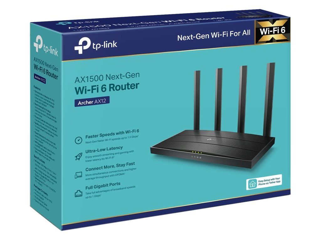 TP-Link Archer AX12Dvoupásmový Wi-Fi router AX1500 pracující v pásmech 2,4 a 5 GHz s podporou standardů 802.11a/b/g/n/ac/ax. Je vybaven nejnovější bezdrátovou technologií Wi-Fi 6, která přináší vyšší rychlost, větší kapacitu a snížené přetížení sítě. V pásmu 2,4 GHz dosahuje přenosových rychlostí až 300 Mbit/s a v pásmu 5 GHz až 1201 Mbit/s. Technologie Beamforming detekuje zařízení a soustředí sílu signálu jejich směrem, a to zejména do míst, která jsou hůře dosažitelná. Pro snadné nastavení a použití lze využít mobilní aplikaci Tether nebo webové rozhraní.