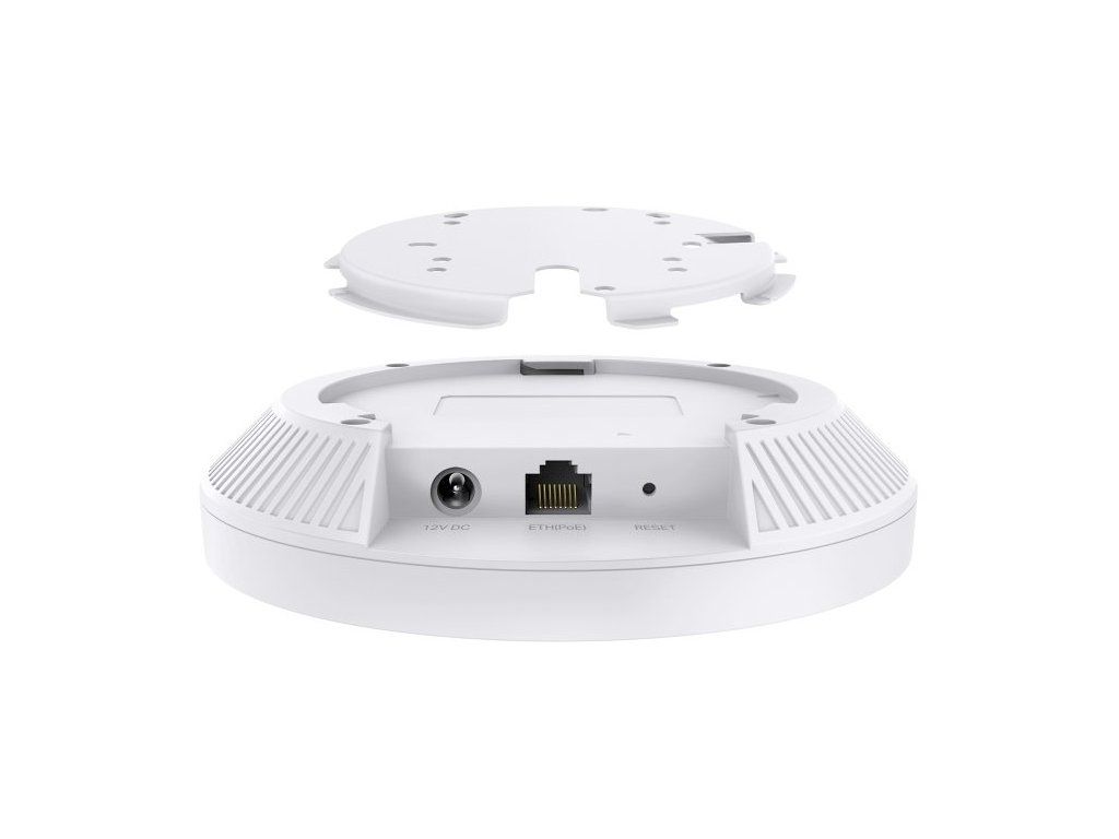 Přístupový bod podporuje jak 802.3at PoE, tak napájení adaptérem DC 12 V (není součástí balení). Elegantní vzhled a jednoduché uchycení pro snadné upevnění na strop usnadňuje nasazení a flexibilitu.