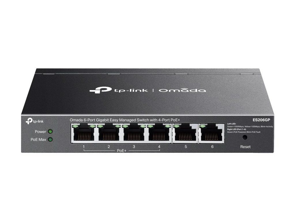 TP-Link ES206GPSwitch nabízí 6× GbE RJ-45, z toho 4× port s podporou PoE+ 802.3at/af a celkovým zatížením až 65 W. Přepínací kapacita dosahuje až 12 Gbps a rychlost směrování až 7,4 Mpps. Funkce Storm Control chrání proti broadcastovým, multicastovým a neznámým unicastovým bouřím. Řízení síťového provozu (QoS) nabízí možnosti pokročilého řízení provozu pro plynulejší a rychlejší přenos vašich dat.