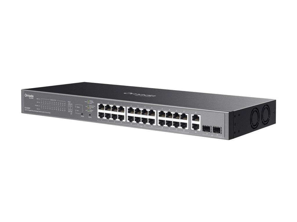 Omada ES228GP je pokročilý síťový switch určený především pro kamerové systémy a malé firmy. Nabízí 26 gigabitových RJ45 portů, z nichž 24 podporuje standard PoE+ (802.3at) s celkovým rozpočtem 250W a možností dodávat až 30W na jeden port. Doplňují ho 2 gigabitové SFP sloty pro optické připojení.