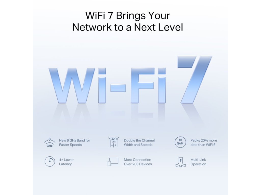 Wi-Fi 7, nejnovější standard Wi-Fi, přichází s ohromujícím výkonem – nabízí vyšší rychlost, nižší latenci, silnější ochranu proti rušení a vyšší účinnost. Připojte se k profesionálům a zažijte čistý výkon nové generace Wi-Fi.