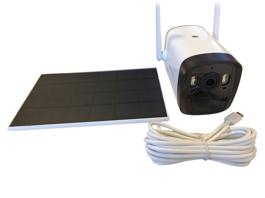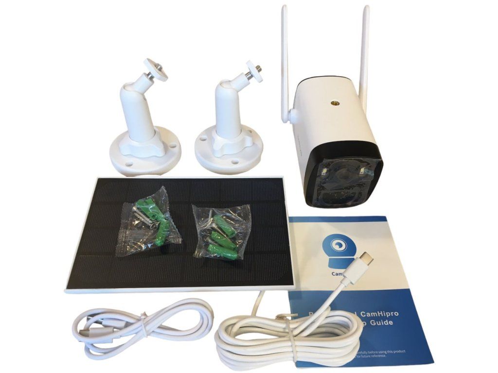 Součástí balení je USB kabel, 2× držák na stěnu, 2× sada hmoždinek a vrutů a solární panel (včetně kabelu o délce přibližně 3 m).