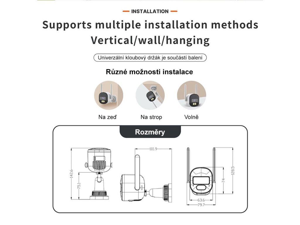 Rozměry: 75 × 65 × 65 mm (bez antény a držáku)