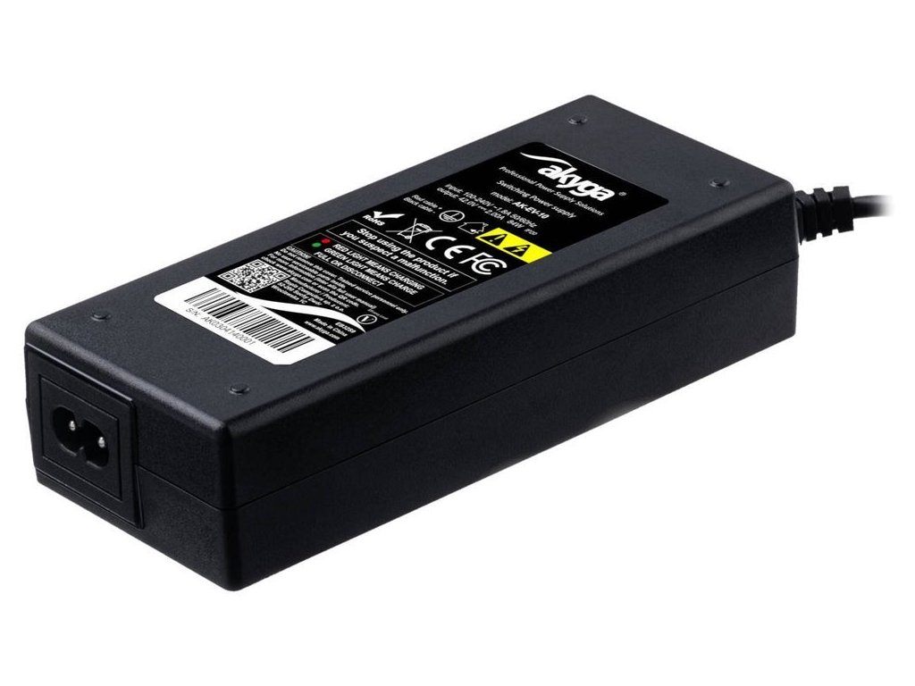 TRX Akyga AK-EV-09Napájecí adaptér o výkonu 110 W pro elektrokola a elektrokoloběžky se 48V baterií. Na jedné straně má oblíbenou zásuvku IEC C8 a na druhé straně kabel bez zakončení, který umožňuje svobodu výběru konektoru v závislosti na nabíjeném zařízení. Přívodní síťový napájecí kabel není součástí balení.