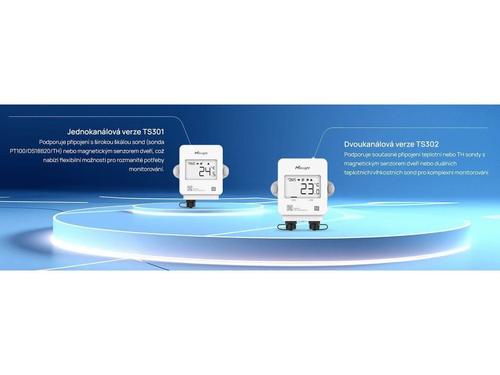 TS302: 2 × Konektory pro dva teplotní/vlhkostní senzory nebo teplotní/vlhkostní sondu + magnetický spínač
