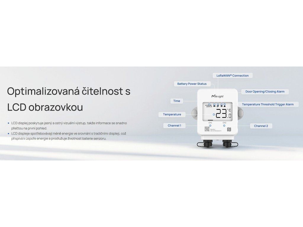 | Pokročilé funkce | Prahový alarm, Změna alarmu, Načtení dat, Opakovaný přenos dat, Řídicí jednotka Milesight D2D, Přenos dat Milesight D2D |