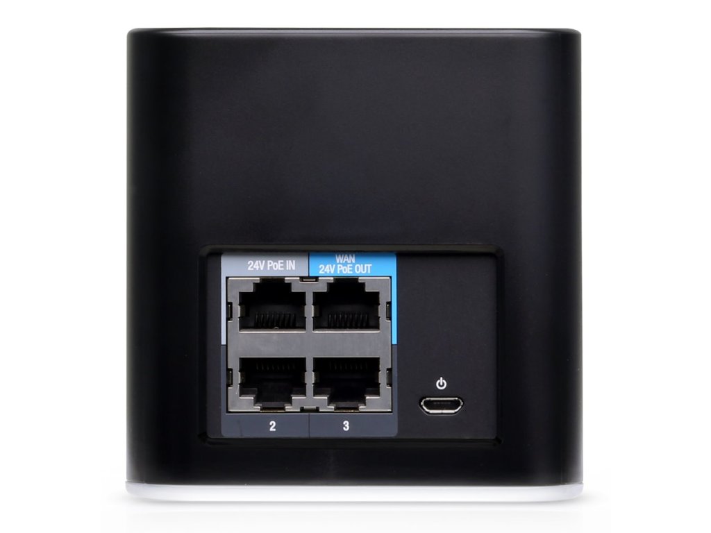 AirCube ISP má čtyři RJ-45 porty, z toho dva porty jsou PoE. Port PoE In slouží pro napájení samotného routeru, port PoE Out podporuje pasivní PoE 24 V na výstupu.