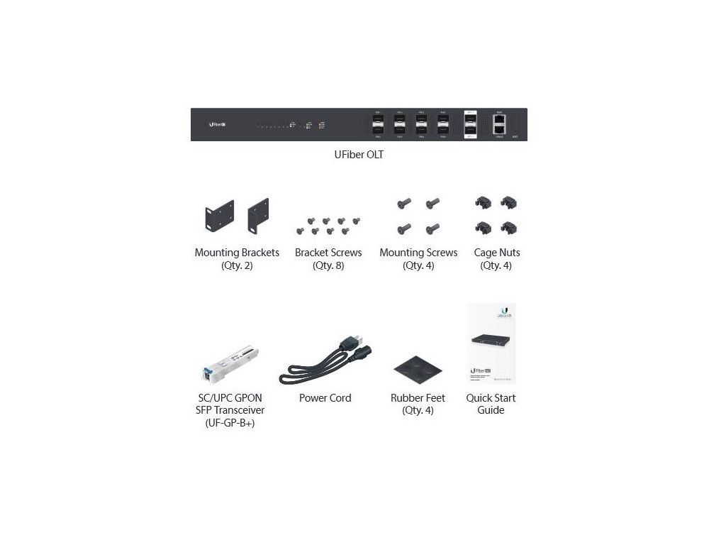 Balení obsahuje příslušenství pro montáž do 19" racku 1U, UFiber GPON B+ modul (UF-GP-B+) a napájecí kabel.
