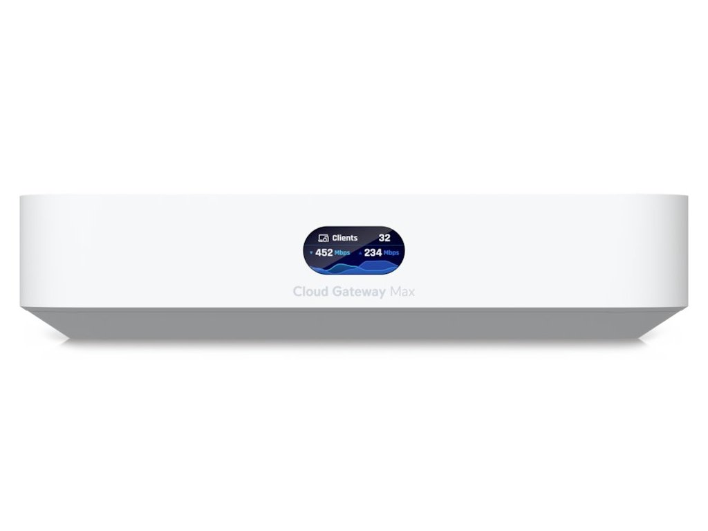 UniFi Cloud Gateway Max je vybavena jedním portem WAN (2,5 GbE RJ-45) a čtyřmi LAN (2,5 GbE RJ-45) porty, které zajišťují vysokorychlostní připojení potřebné pro podporu většiny aplikací náročných na šířku pásma. Vyniká také jako kompaktní řešení zabezpečení sítě, které nabízí kompletní sadu funkcí pro minimalizaci hrozeb, včetně systémů detekce a prevence narušení (IDS/IPS), filtrování obsahu a segmentace provozu na základě VLAN. Disponuje 0,96" LCM displejem, který zobrazuje aktuální stav připojených zařízení.