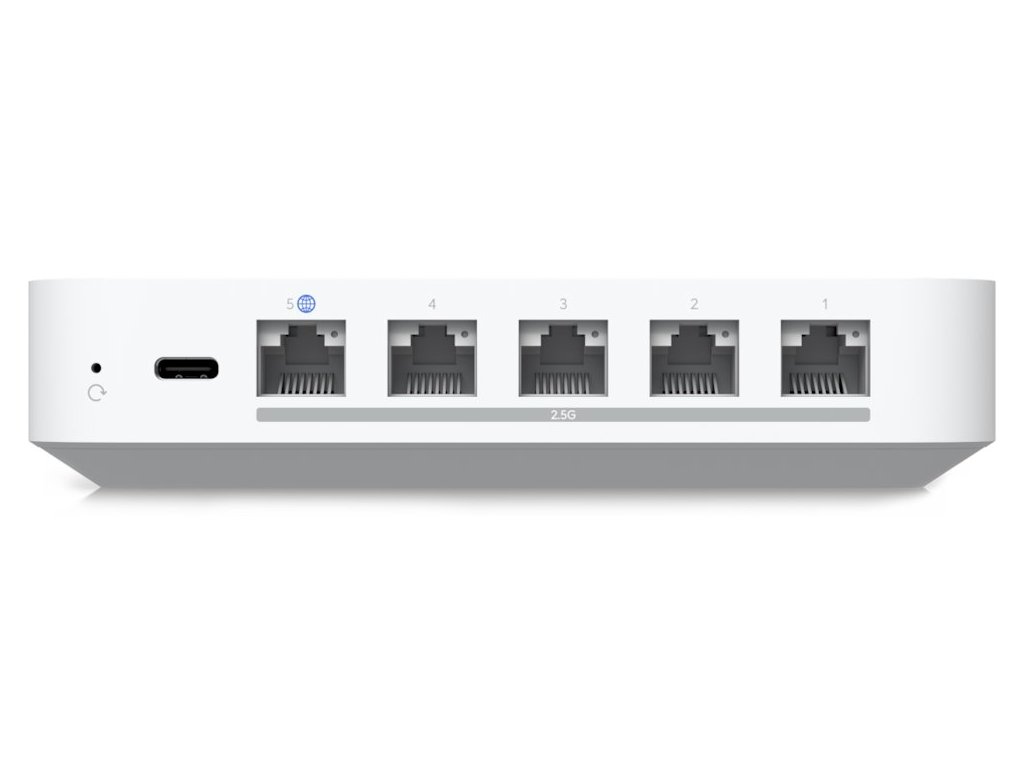 Porty: 1× 2,5 GbE RJ-45 WAN, 4× 2,5 GbE RJ-45 LAN, 1× USB-C (napájení)