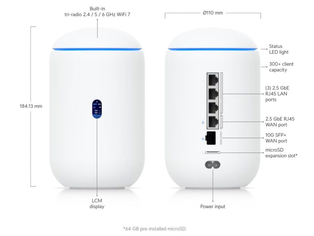 Ubiquiti UniFi Dream Router 7 - Router, 2,4/5/6GHz, Wi-Fi 7, Full UniFi OS, IDS/IPS, 4x 2.5GbE, 1x SFP+, 1x PoE (15W)