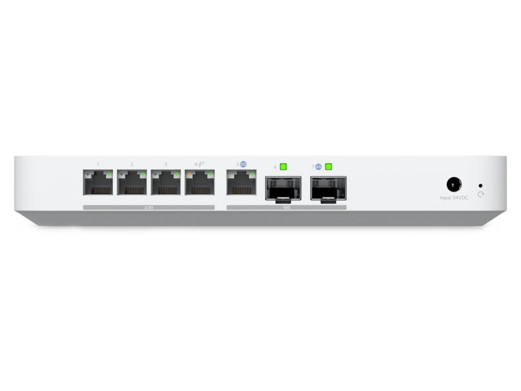 Ubiquiti UniFi Gateway Fiber je vybavena jedním portem 10G RJ-45 WAN, dvěma 10G SFP+ porty (WAN+LAN) a čtyřmi 2,5G RJ-45 porty, které zajišťují vysokorychlostní připojení potřebné pro podporu většiny aplikací náročných na šířku pásma. Vyniká také jako kompaktní řešení zabezpečení sítě, které nabízí kompletní sadu funkcí pro minimalizaci hrozeb, včetně systémů detekce a prevence narušení (IDS/IPS) a filtrování obsahu.