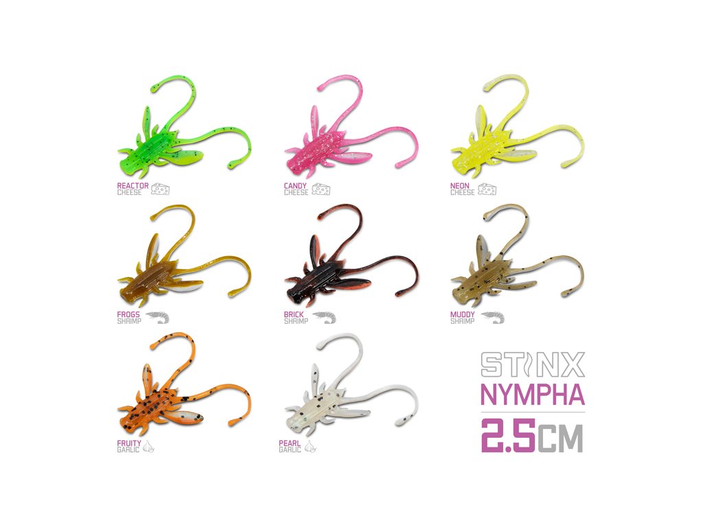 Ultralehká přívlač si získává stále větší popularitu, což nezůstalo bez odezvy u týmu značky Delphin. Výsledkem je umělá nástraha Delphin B! Stinx NYMPHA. Jedinečný tvar nástrahy navržený našimi designéry představuje originální kombinaci vodního hmyzu a korýše, díky čemuž ve vodě působí mimořádně realisticky a přirozeně. Detailně propracované tělo spolu s dlouhými nožičkami vytváří neodolatelný pohyb, kterému jen těžko odolají pstruzi, okouni, jelci, ale i další druhy, jako například bílé ryby. Nástraha je vyrobena z kvalitního měkkého materiálu a obsahuje sůl, což zvyšuje její atraktivitu a zajišťuje, že na ni ryby opakovaně a s chutí útočí. Pro ještě větší účinnost je dostupná ve třech osvědčených příchutích – kreveta, česnek a sýr. Nástrahy jsou navíc uloženy v praktické nádobě s tekutým atraktorem, do kterého lze uložit použitou nástrahu, a tak opětovně zvýšit její atraktivitu. Technické parametry: Hmotnost nástrahy: 0,90 gDoplňkové parametry