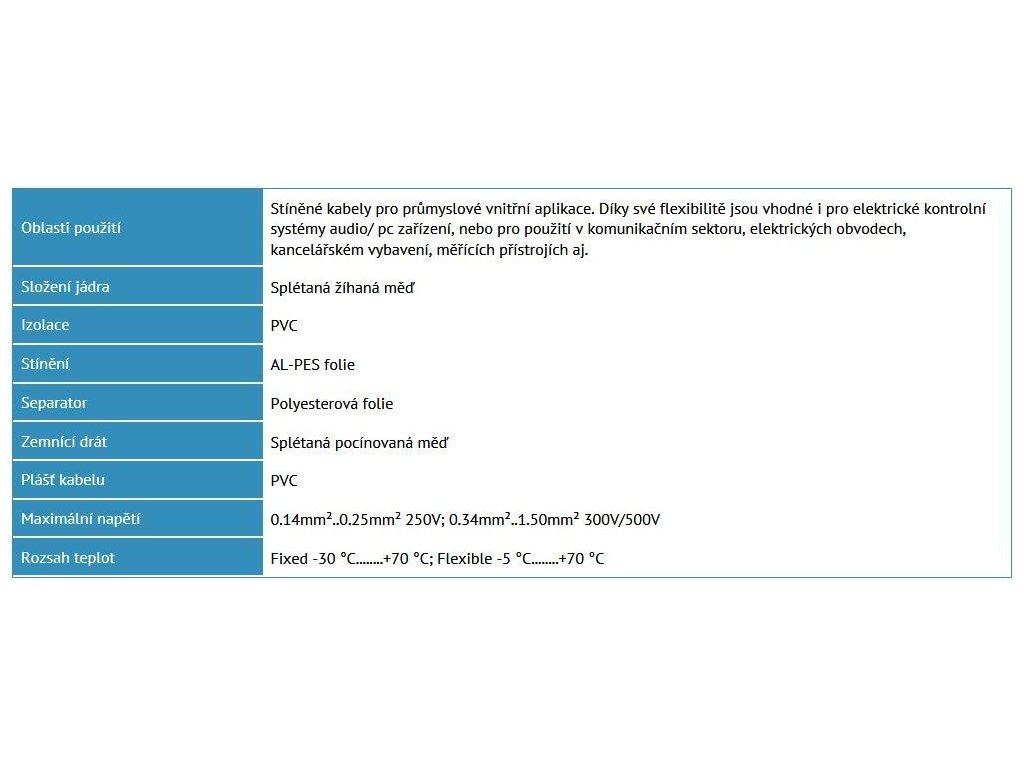 | VEZ 2x0,5+8x0,22 | Stíněný kabel 2x0,5 + 8x0,22mm, lanko, baleno po 100m |