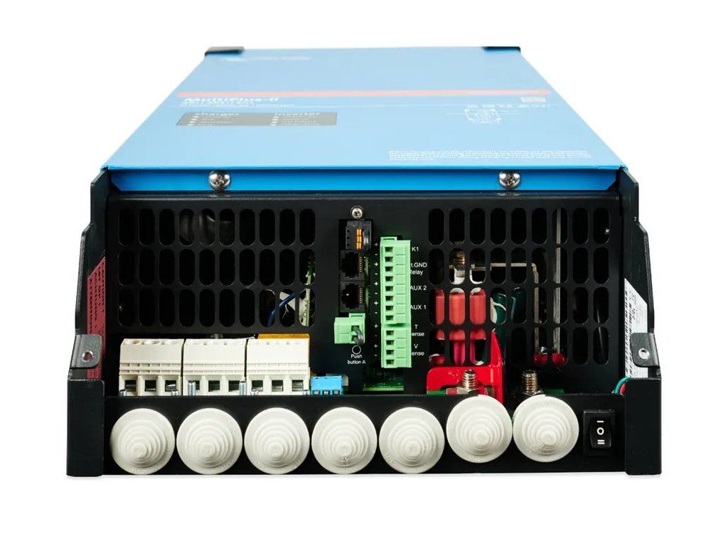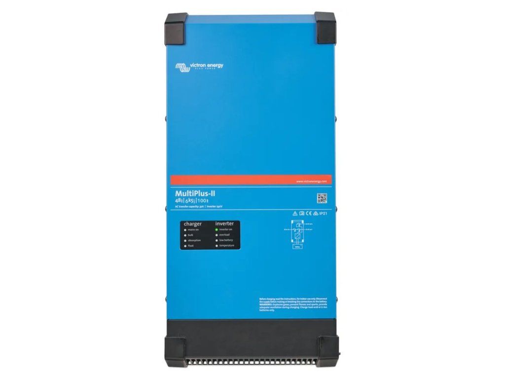 MultiPlus-II GX je výkonný DC-AC hybridní měnič/nabíječ s čistě sinusovým výstupem, integrovanou adaptivní nabíječkou baterií a ultra rychlým transferovým přepínačem zdroje napájení (baterie/externí AC zdroj). Zařízení poskytuje kontinuální výkon 6 kW při napětí 230 V AC a nabízí nabíjecí proud až 100 A pro rychlé dobíjení baterií.