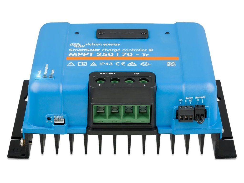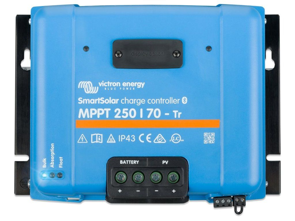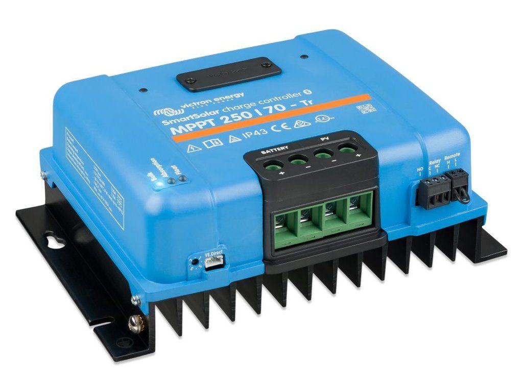 Victron SmartSolar 250/70-Tr MPPTRobustní a rychlý MPPT regulátor pro náročné podmínky s napětím panelů až 250 V, nabíjecí proud 70 A. Baterie 12/24/48 V, FV max. 1000/2000/4000 Wp. Vestavěné Bluetooth a konektor pro zásuvný displej.