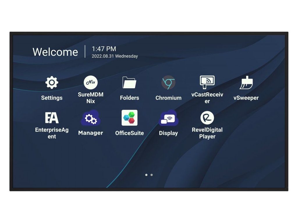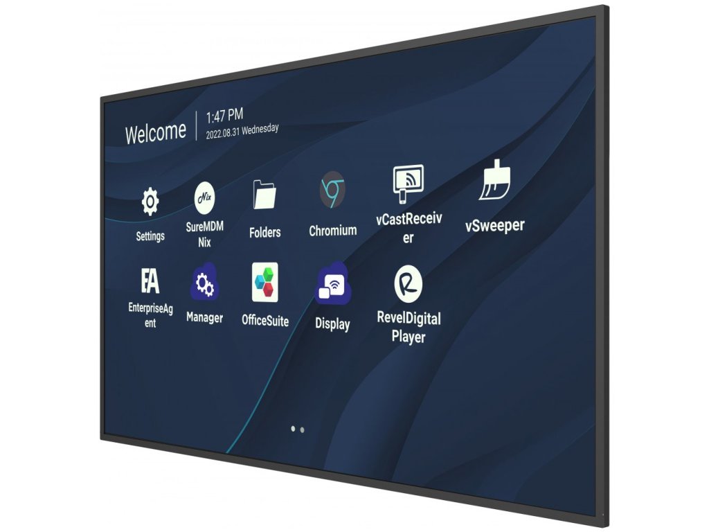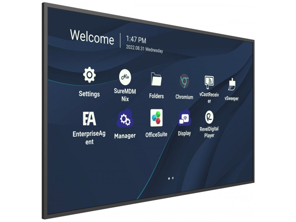 ViewSonic CDE9830LED displej s úhlopříčkou 98", vhodný pro výuku či prezentace, disponuje 4K Ultra HD rozlišením 3840 × 2160 bodů s poměrem stran 16 : 9. Displej nabízí svítivost 500 cd/m2, dobu odezvy 8 ms a kontrastní poměr 1200 : 1. Potěší také široké pozorovací úhly 178° horizontálně i vertikálně. Použitý operační systém Android 11 umožňuje mimo jiné přímé přehrávání videa, prohlížení fotografií či poslech hudby z přítomných USB portů, nebo z interního úložiště o velikosti 32 GB. O plynulý chod zařízení se stará čtyřjádrový procesor doplněný 4 GB operační paměti. Nástroj myViewBoard Display umožňuje bezdrátové zrcadlení obrazovky z počítače či notebooku skrze internetový prohlížeč. Připojení k internetu je realizováno pomocí konektoru RJ-45. K dispozici je také port USB-C, který kromě vysokorychlostního přenosu videa a dat umožňuje napájení připojených zařízení až do 65 W. Kromě toho jsou přítomny stereo reproduktory s celkovým výkonem 20 W. Díky konstrukci je panel schopný provozu 24 hodin denně, 7 dní v týdnu.