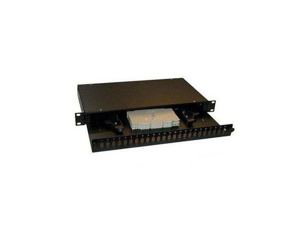 XtendLan OR025-24-SC19" optický rozvaděč, barva černá, kovová skříň hloubky 245 mm, pro 24 adaptérů SC simplexní nebo 24 adaptérů LC duplexní, součástí je jedna kazeta na 12 svarků, další kazety lze dokoupit. Vana je výsuvná.