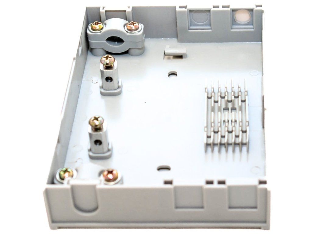 Výstupní porty lze osadit simplex adaptéry pro ST, SC, FC a duplexním LC. Nejsou součástí balení. Součástí je držák ochran svárů pro pigtail kabely (6 otvorů, 3 mm průměr).