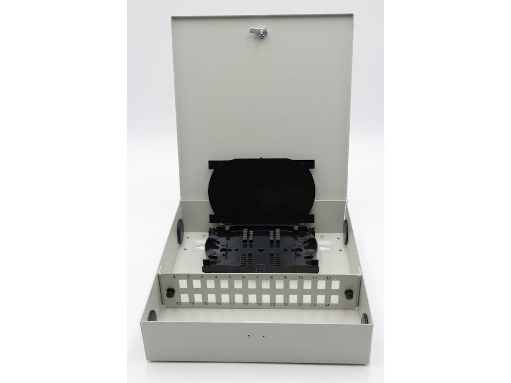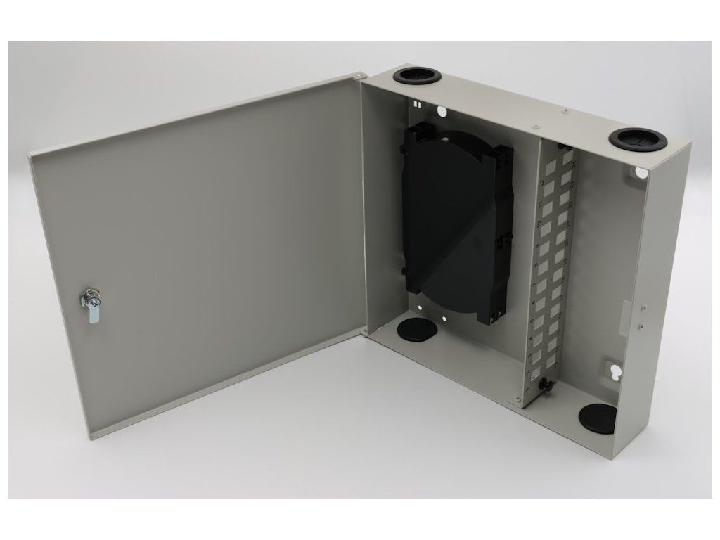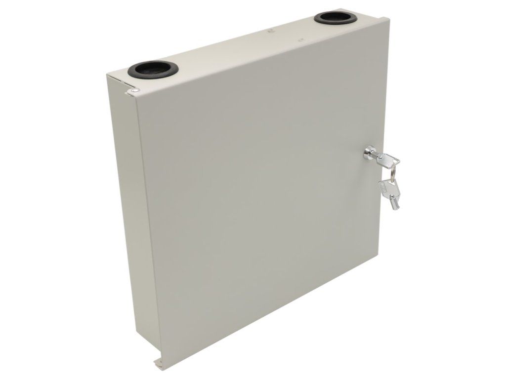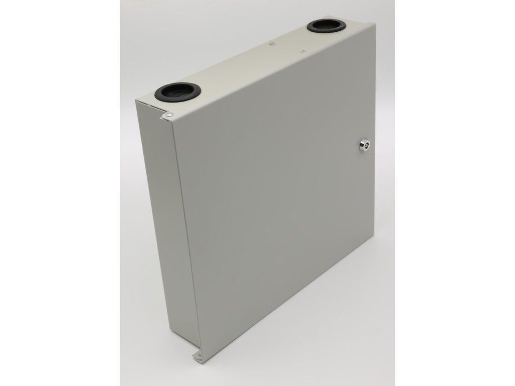 XtendLan OR038-24-SCNástěnný optický rozvaděč pro 24 vláken, 24× simplex SC nebo duplex LC, barva světle šedá, kovová skříň, kazeta na svarky, zámek.