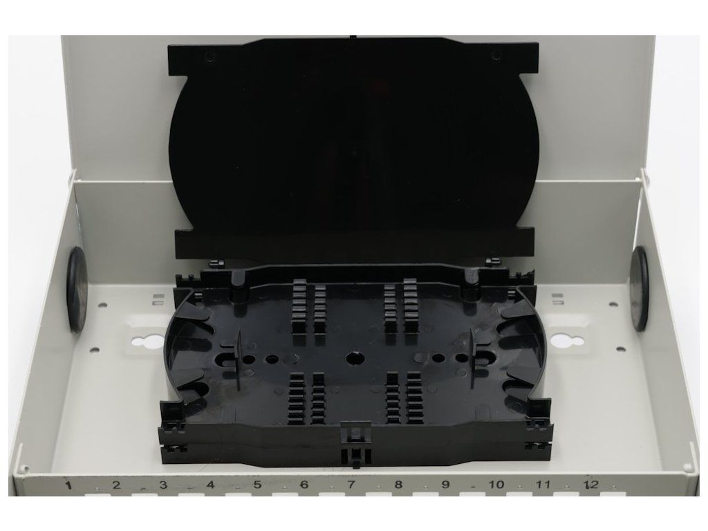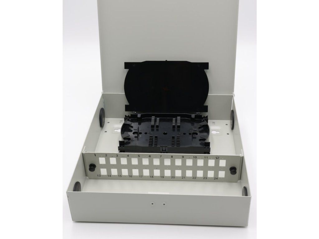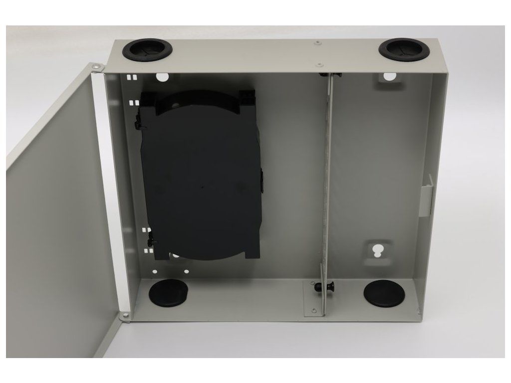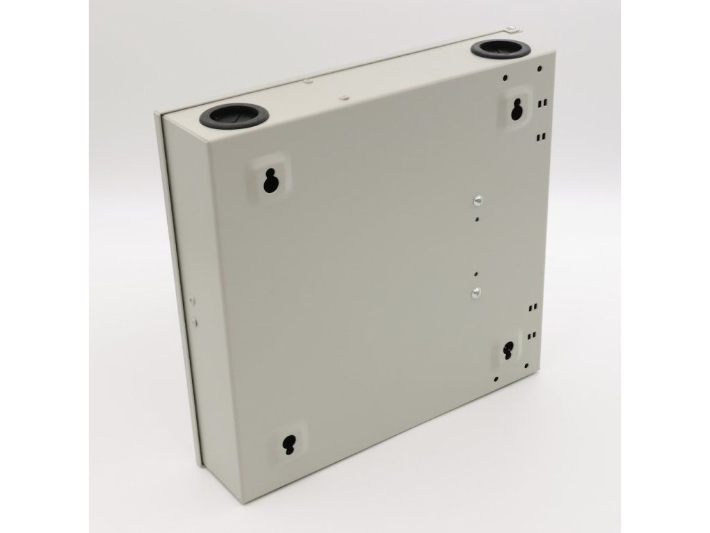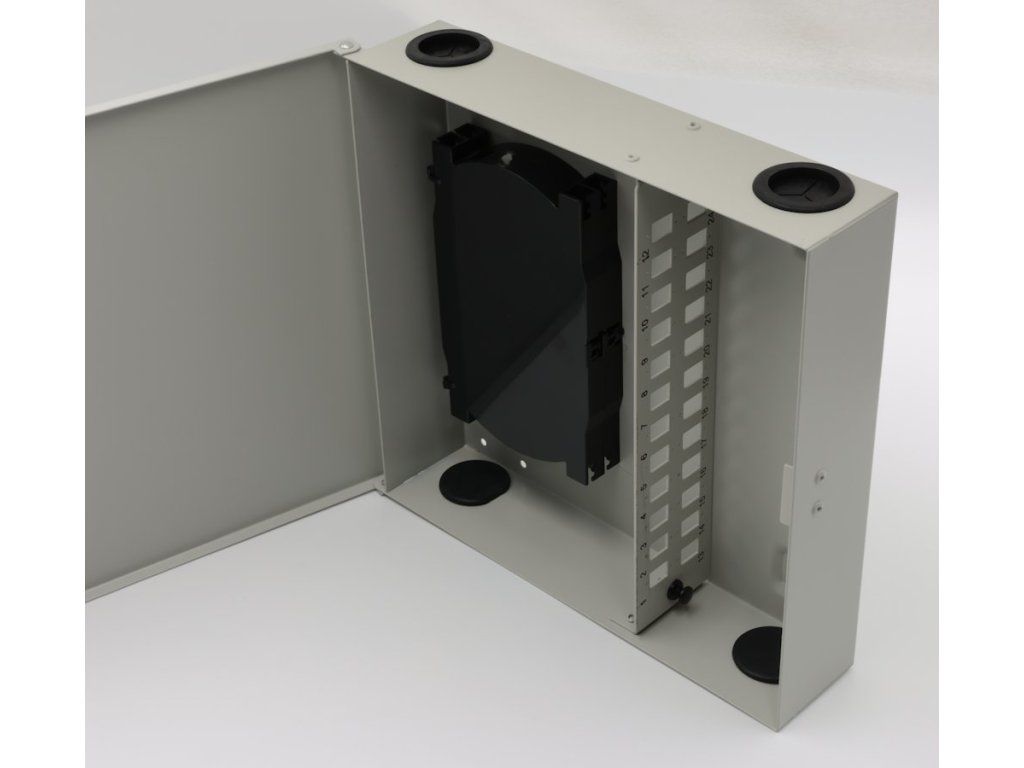 XtendLan OR038-24-SCNástěnný optický rozvaděč pro 24 vláken, 24× simplex SC nebo duplex LC, barva světle šedá, kovová skříň, kazeta na svarky, zámek.