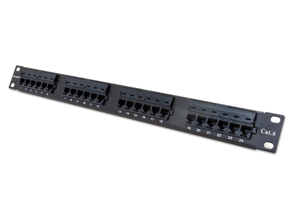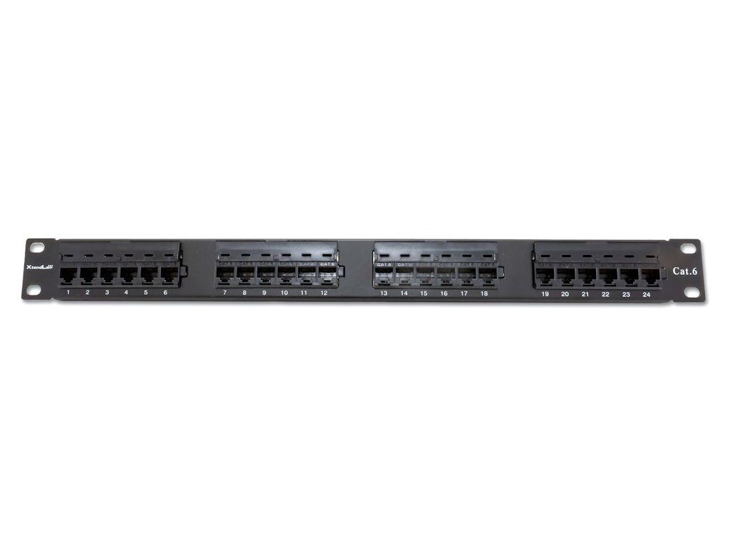 XtendLan PP19-24C6UPropojovací panel, 24 portů RJ-45, CAT6, nestíněný, narážecí kontakty normal. Kontakty jsou na svorkovnici odlišeny barvami podle typu zapojení, a to buď podle T568A, nebo T568B nebo číselně značeny.