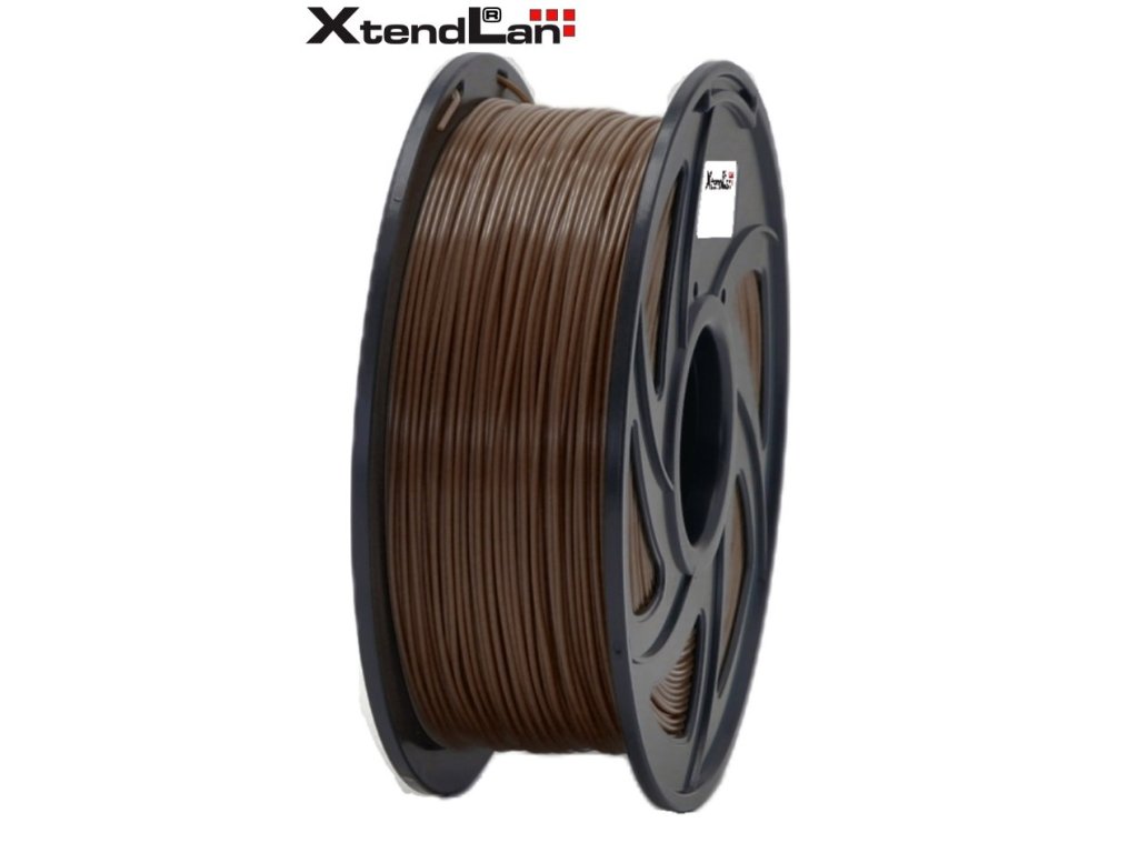XtendLAN PETG filament 1,75 mm hnědý 1 kgPlastové vlákno (filament) pro 3D tisk, v návinu na cívce. PET-G (PolyEtylénTereftalát Glykolem modifikovaný) je materiál velmi známý díky plastovým lahvím. PETG v sobě spojuje to nejlepší z vlastností ABS a PLA pro 3D tisk. Jde o pevný a houževnatý materiál. Odolností se materiál blíží polykarbonátům. Vyznačuje se velmi malým tepelným smrštěním a je vhodný pro tisk i velkých objektů. Má velkou odolnost proti rozpouštědlům a kyselinám. Odolává vysokým i nízkým teplotám. Při 3D tisku má velmi dobrou přilnavost k podložce. Vytištěný předmět lze tepelně leštit. Filament je chráněný vakuovým balením a v každém balení je přítomen vysoušecí sáček, který zabraňuje případnému působení vlhkosti na materiál. Dodáváno v kartónovém obalu s okénkem pro kontrolu barevnosti.