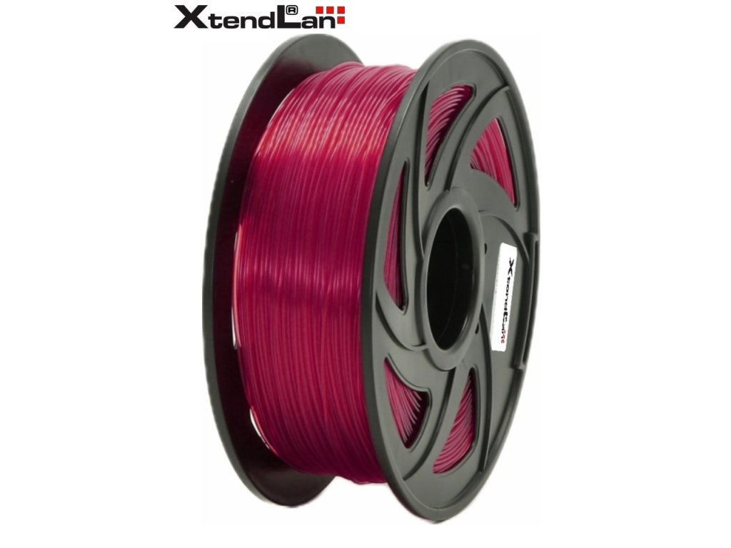 XtendLAN PETG filament 1,75 mm průhledný červený 1 kgPlastové vlákno (filament) pro 3D tisk, v návinu na cívce. PET-G (PolyEtylénTereftalát Glykolem modifikovaný) je materiál velmi známý díky plastovým lahvím. PETG v sobě spojuje to nejlepší z vlastností ABS a PLA pro 3D tisk. Jde o pevný a houževnatý materiál. Odolností se materiál blíží polykarbonátům. Vyznačuje se velmi malým tepelným smrštěním a je vhodný pro tisk i velkých objektů. Má velkou odolnost proti rozpouštědlům a kyselinám. Odolává vysokým i nízkým teplotám. Při 3D tisku má velmi dobrou přilnavost k podložce. Vytištěný předmět lze tepelně leštit. Filament je chráněný vakuovým balením a v každém balení je přítomen vysoušecí sáček, který zabraňuje případnému působení vlhkosti na materiál. Dodáváno v kartónovém obalu s okénkem pro kontrolu barevnosti.