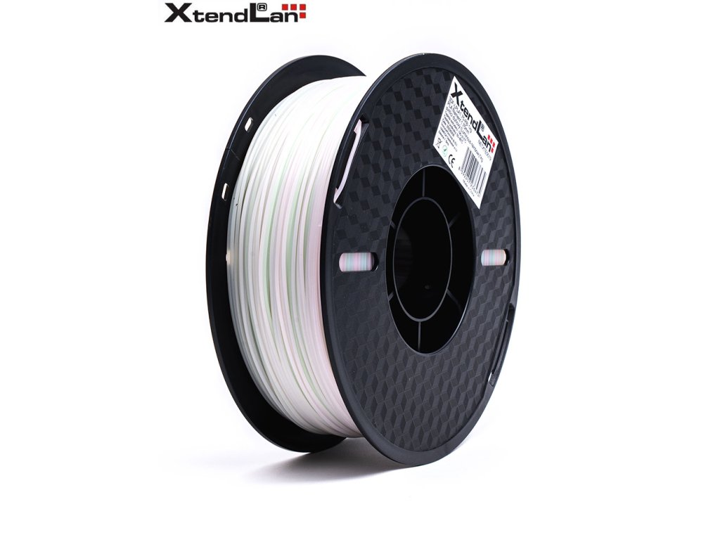 XtendLan PLA filament 1,75 mm svítící duhový 1 kgPlastové vlákno (filament) pro 3D tisk, v návinu na cívce. PLA (PoLylactic Acid, kyselina polymléčná) je nejpopulárnější 3D tiskový materiál. Především se při jeho tisku neuvolňuje nepříjemný zápach a není problémem tisk na neohřívanou podložku. Je rozměrově stabilní s velmi malým tepelným smrštěním a je vhodný pro tisk i velkých objektů. Jde o biologicky odbouratelný materiál. Není vhodný do vlhkého prostředí. Při 3D tisku má velmi vhodnou přilnavost k podložce - nepotřebuje, aby podložka byla ohřívána a zároveň lze výrobek snadno z podložky sejmout. Vytištěný předmět lze ručně brousit a lakovat. Filament je chráněný vakuovým balením a v každém balení je přítomen vysoušecí sáček, který zabraňuje případnému působení vlhkosti na materiál. Dodáváno v kartónovém obalu s okénkem pro kontrolu barevnosti.