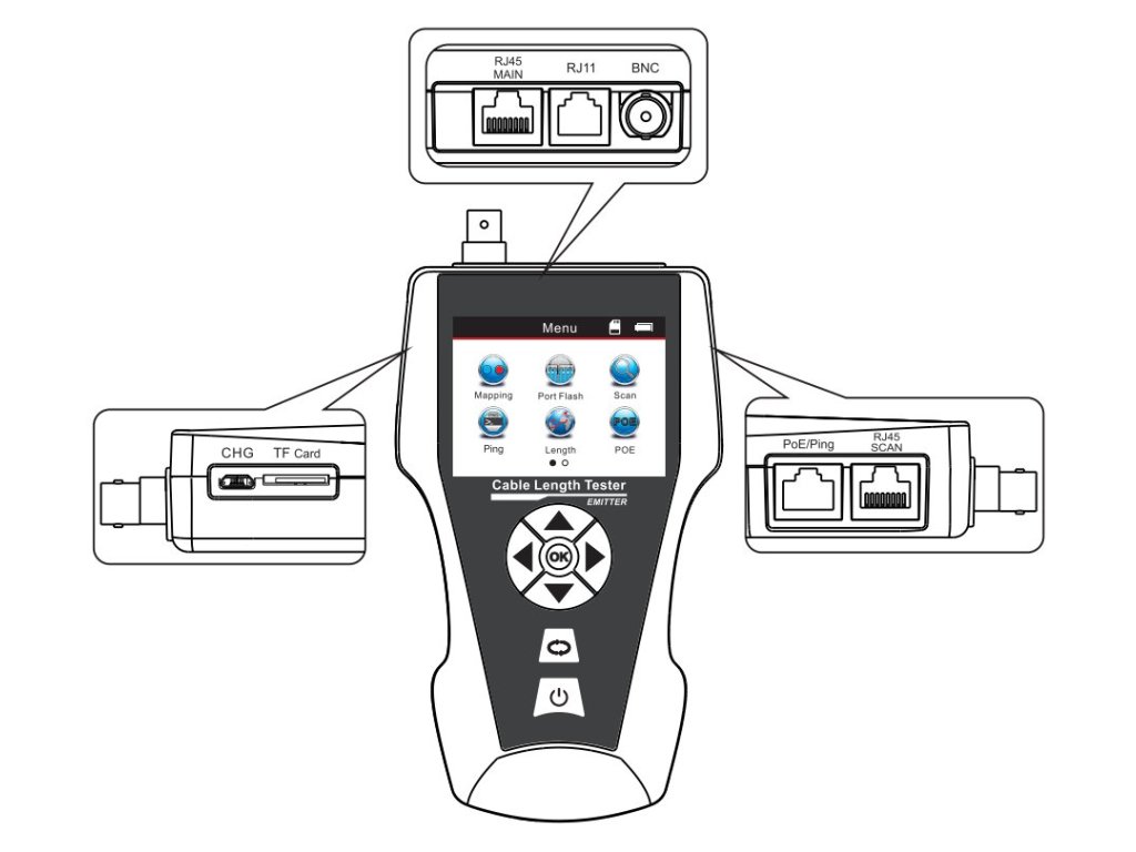 - Tester UTP/STP (RJ-45), koaxiálních (BNC) a telefonních (RJ-11) vedení.