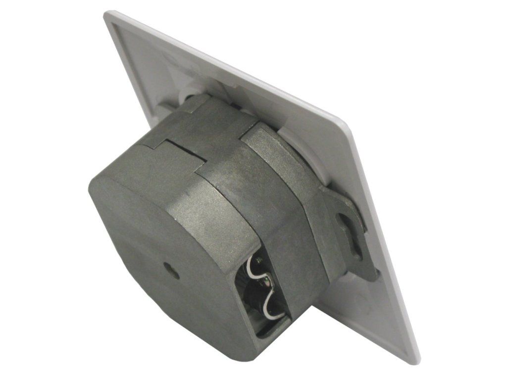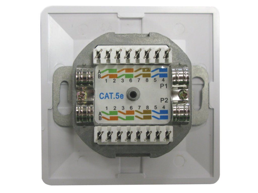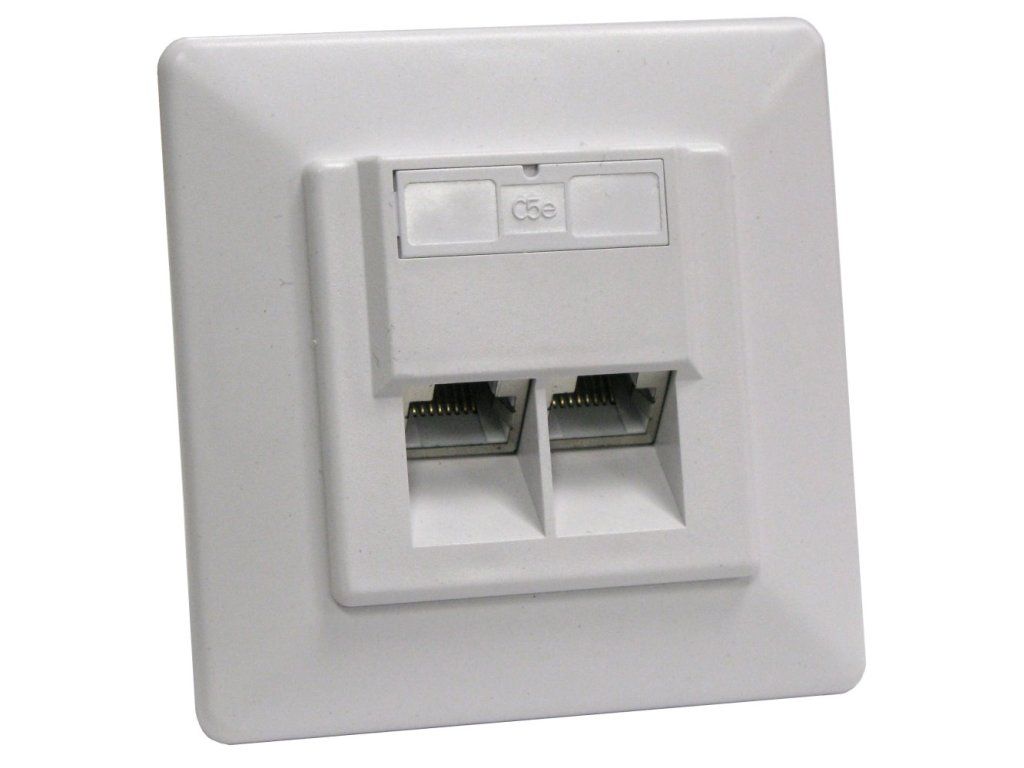 Zásuvka 2x RJ-45, stíněná, pod omítku. CAT5E, konektory RJ-45 orientovány šikmo v úhlu 45 st., barva bílá, montáž do krabice pod omítku, narážecí kabelové konektory (Duální - 110 i LSA). Instaluje se do běžných elektroinstalačních krabic.