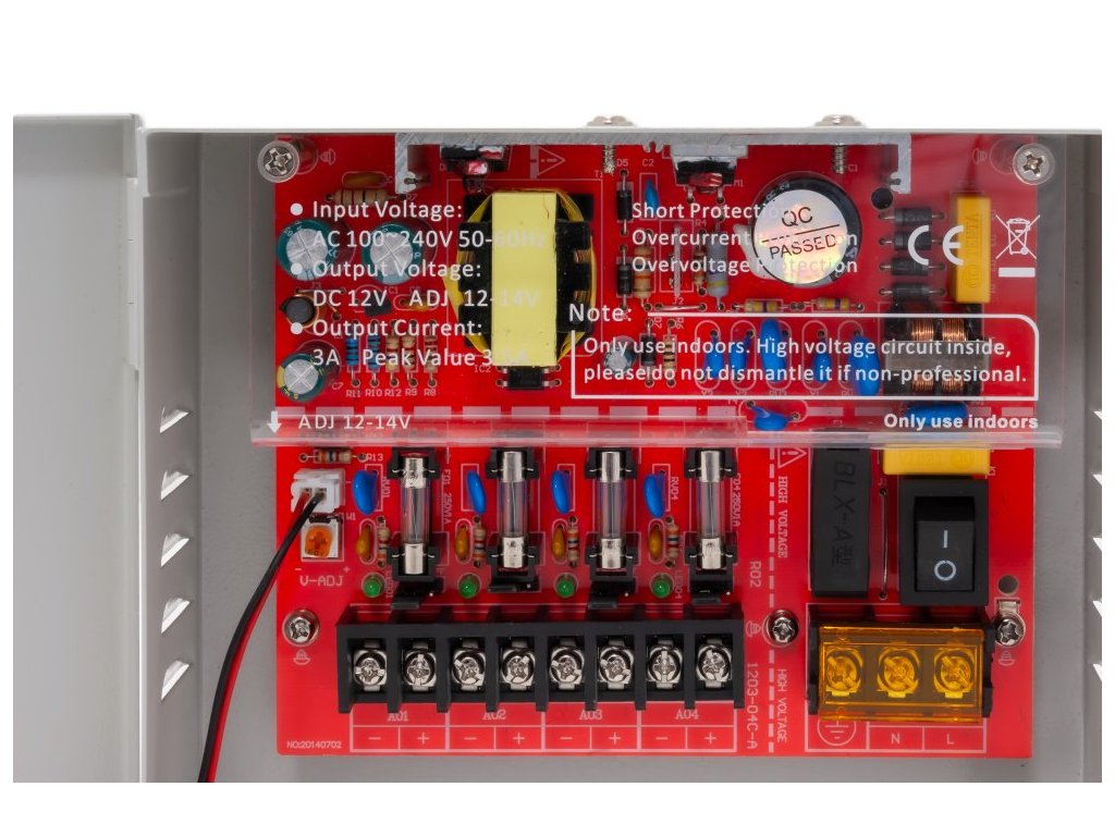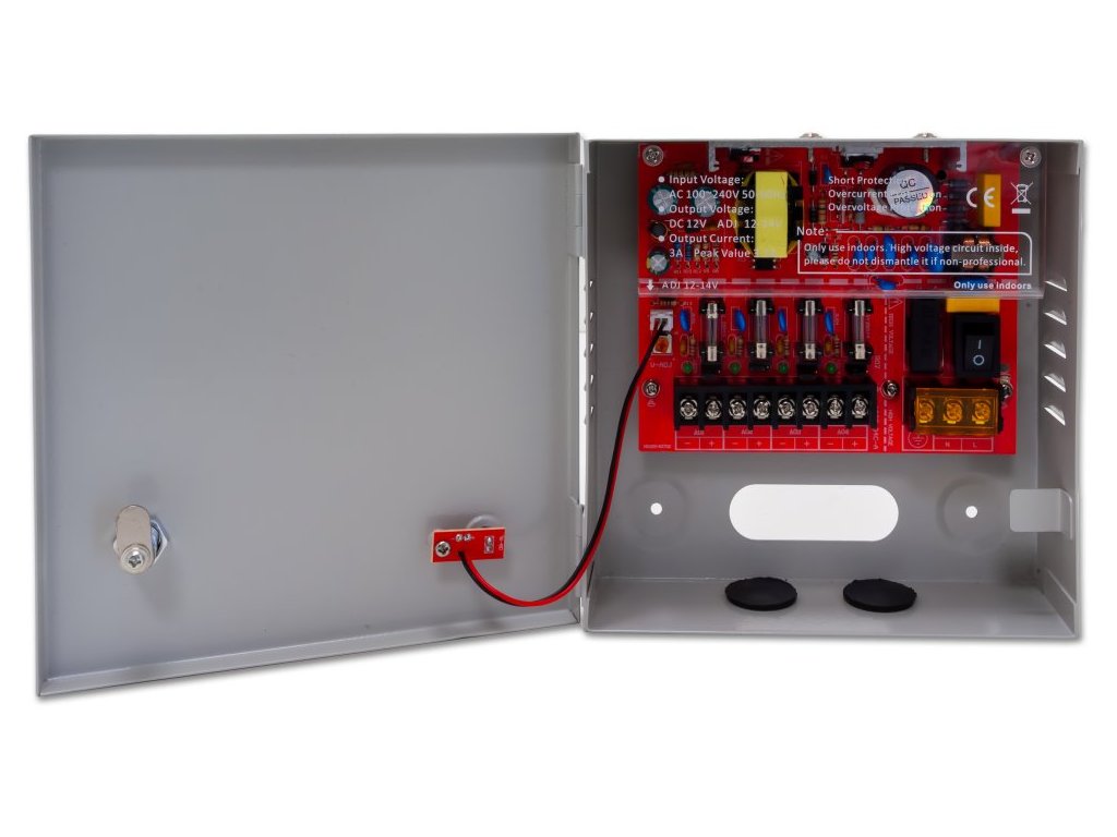 XtendLan ZSW04F-1214-36Stabilizovaný napájecí zdroj pro čtyři spotřebiče, nastavitelné napětí DC 12-14 V, každý port max. 1 A. Celkový výstupní proud 3 A, krátkodobě 3,5 A. Skříňka na zeď s instalovaným PCB s hlavním vypínačem a kabelovými průchodkami. Připojení kabelů k interní svorkovnici. Ochrana proti zkratu přístrojovou pojistkou, ochrana proti přepětí. LED signalizace funkčnosti portů. Dvířka jsou vybavena jednoduchým zámkem.