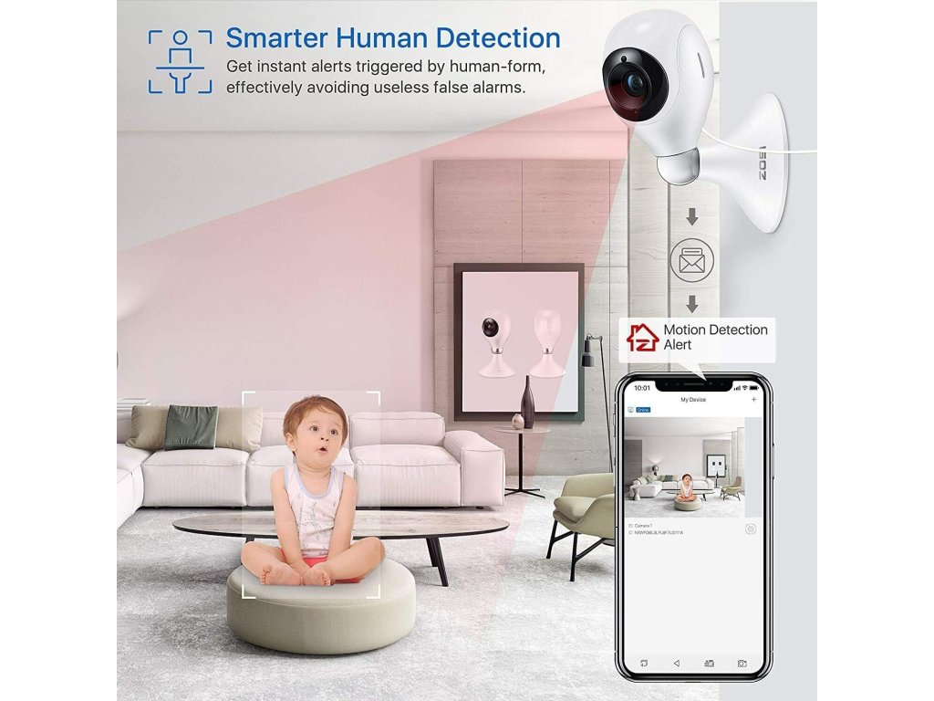 Vylepšená detekce člověka spustí výstrahy (e-maily, upozornění aplikace a bzučák) okamžitě, když je člověk spatřen ve vaší pohybové zóně, aby vám dal vědět, že se někdo blíží k vašemu domu, čímž se účinně zabrání „falešným poplachům“ způsobeným domácími mazlíčky, auty nebo listím.